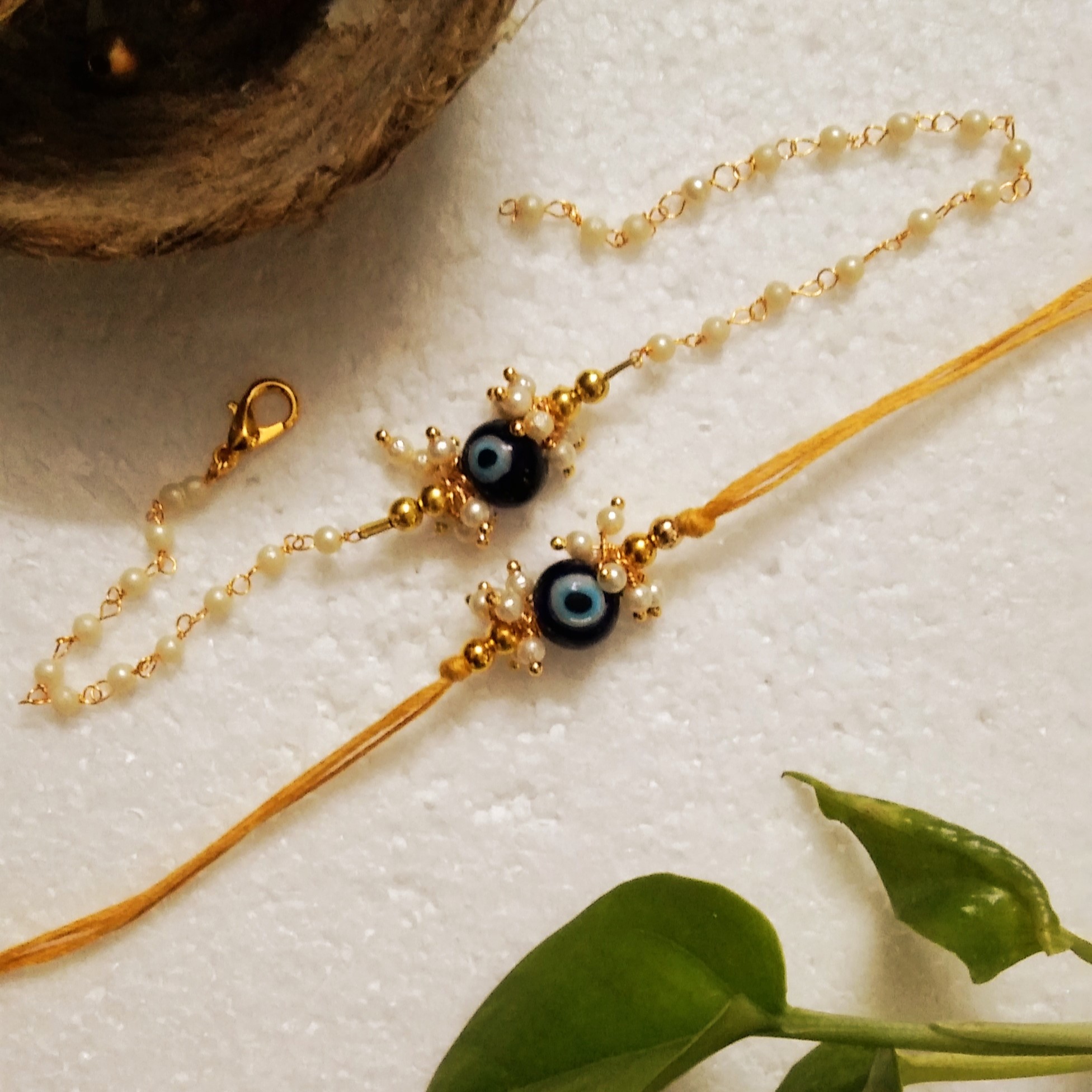 This designer rakhi uses glass/metal/acrylic beads to create a festive accessory that's as unique as your bond, perfect for honoring traditions in style.