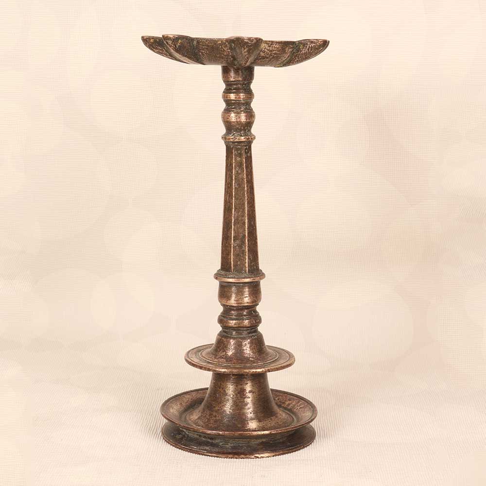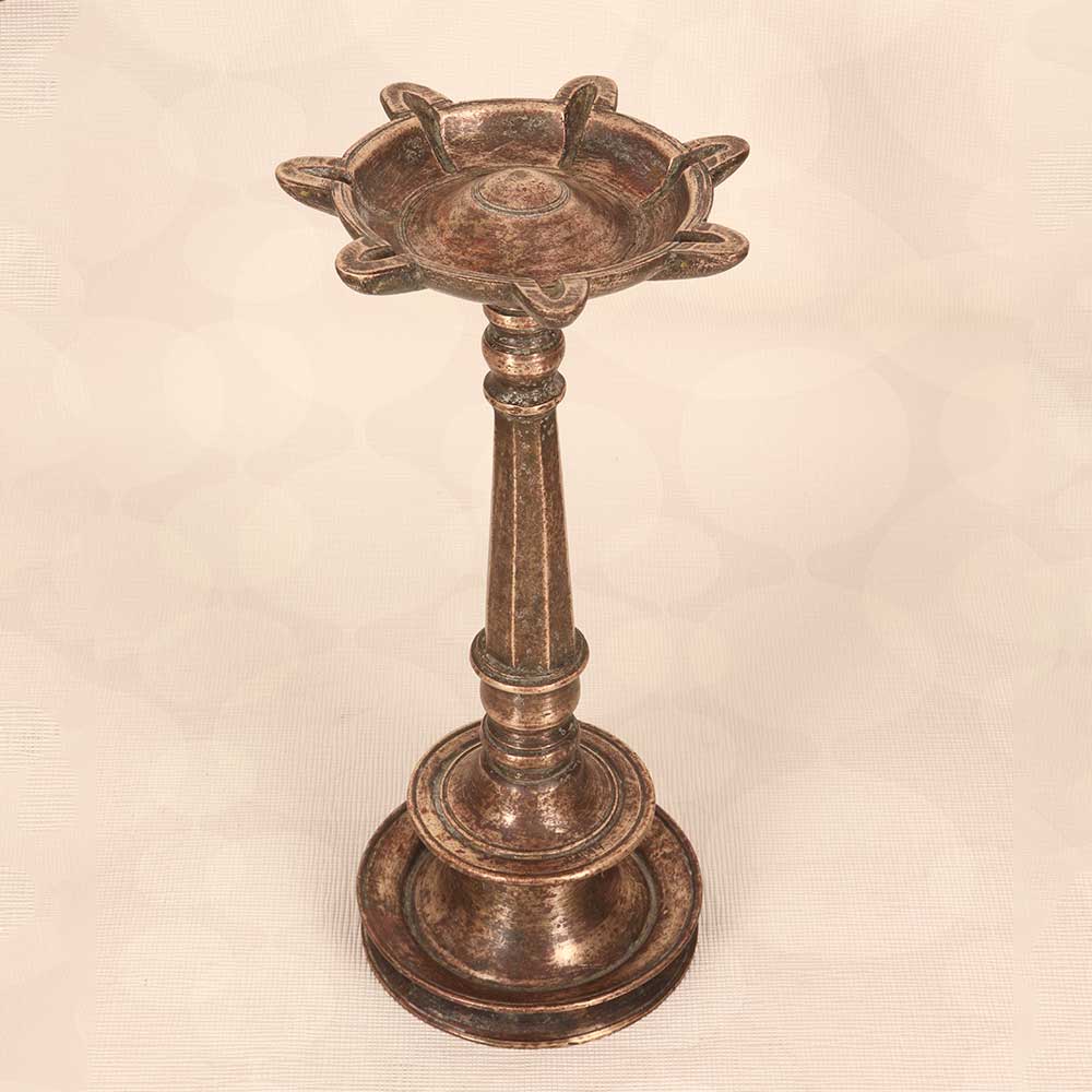 Light up your home with the warm glow of tradition. Our vintage brass oil lamp beautifully recreates the ambiance of ancient India. The intricately engraved brass base supports 7 jyots for the sacred flame. Fill with mustard oil or ghee and spark the cotton wicks to cast a soothing aura. The lamp's elegant design adds exotic flair to any room. The lamp's 7 flames represent the 7 chakras, lighting your way to inner peace. Brass construction ensures durability and timeless style. The hand-engraved detailing connects you to the rich history of Indian craftsmanship. Perfect for creating a spiritual retreat right in your living room. Bring ancient tradition into your modern home. This oil lamp invokes tranquility and transports you to a simpler time. A wonderful gift for the world traveler, history buff, or anyone seeking an authentic piece of India.