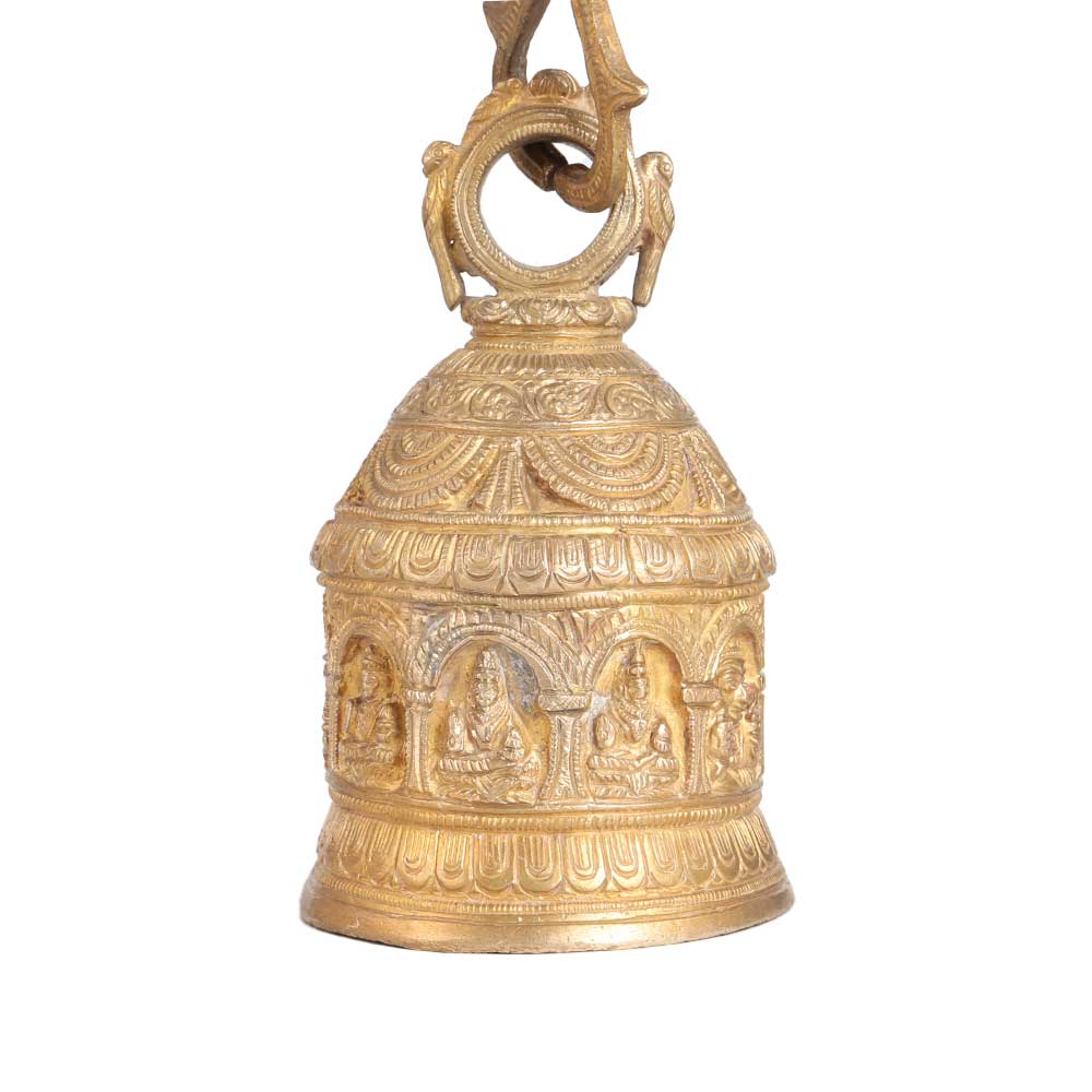 Add an ethnic touch to your prayer room by hanging this brass bell with engraved Hindu deity figures. It is made of high quality brass and has a shiny golden finish that makes it a suitable gift for any special, festive and auspicious occasion for your family, friends or relatives. A sturdy looking temple bell with a chain for hanging in the temple. It is believed that the sound of the bell in the temple calms the mind of the worshipper and helps to focus on the deity. You can hang this auspicious bell in your prayer room or temple in restaurant, hotel or shop to add an aesthetic touch to the interior.