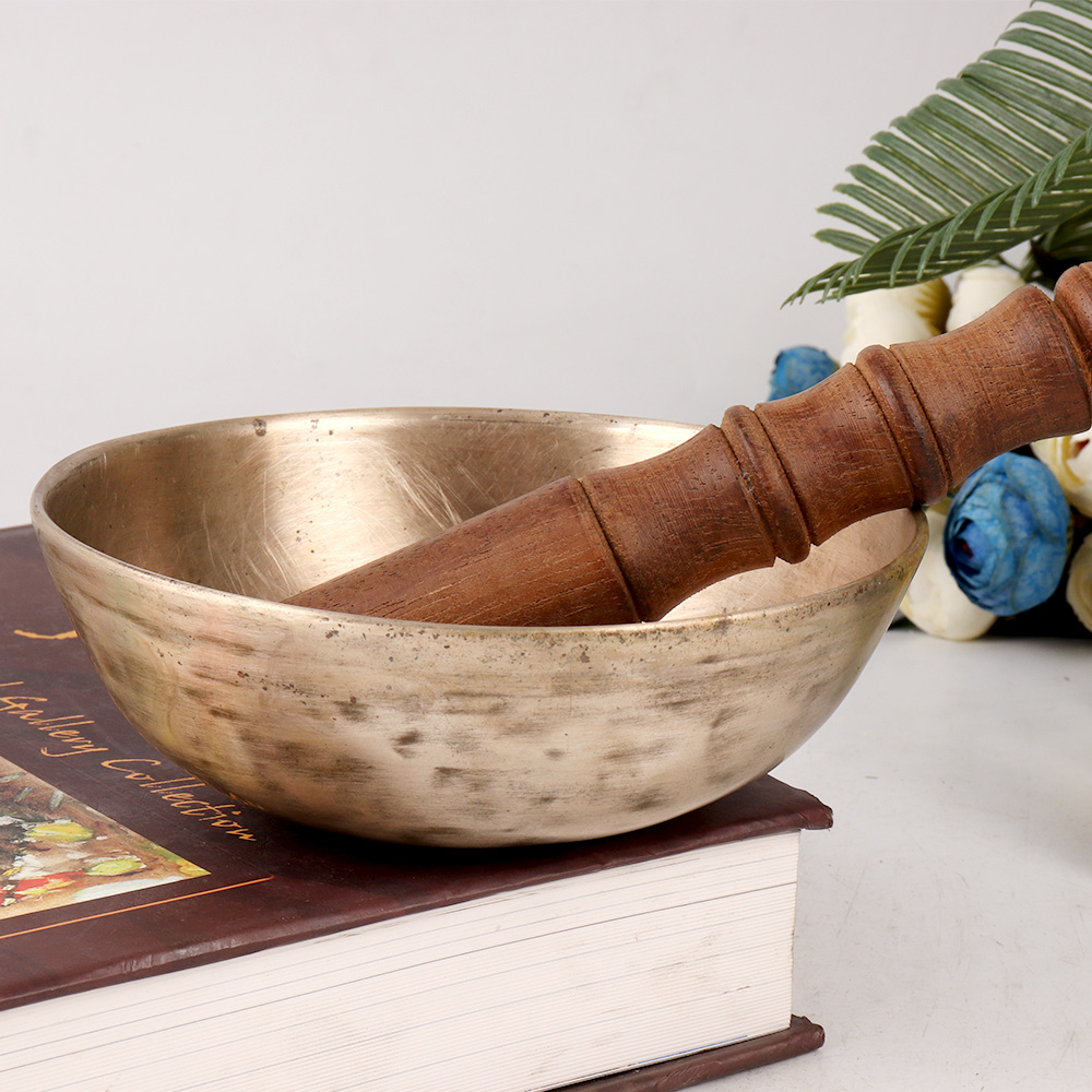 Enhance your meditation practice with this exquisite Om singing bowl, handcrafted with care from high-quality bell metal. The bowl's harmonic tones and soothing vibrations promote relaxation, mindfulness, and stress relief. Buy this handmade Tibetan singing bowl online from our website to get a hassle free delivery right at your doorstep. Featuring antique finish and plain design, this beautiful bowl adds a touch of spirituality to your practice. It comes with a wooden mallet for easy playing and makes a meaningful gift for special, festive and auspicious occasions for your near and dear ones who value their well-being and spiritual journey.