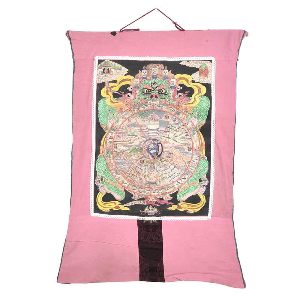 Wheel of life that detailed representation of basic Buddhist belif i.e. the transmigratory exsistance, it explains in a most lucid manner the theory of rebirth. The wheel is held in the embrace of Shenje (ruler of the Dead) showing that all beings must eventually meet Death. The wheel is divided into axle, spokes and rim.