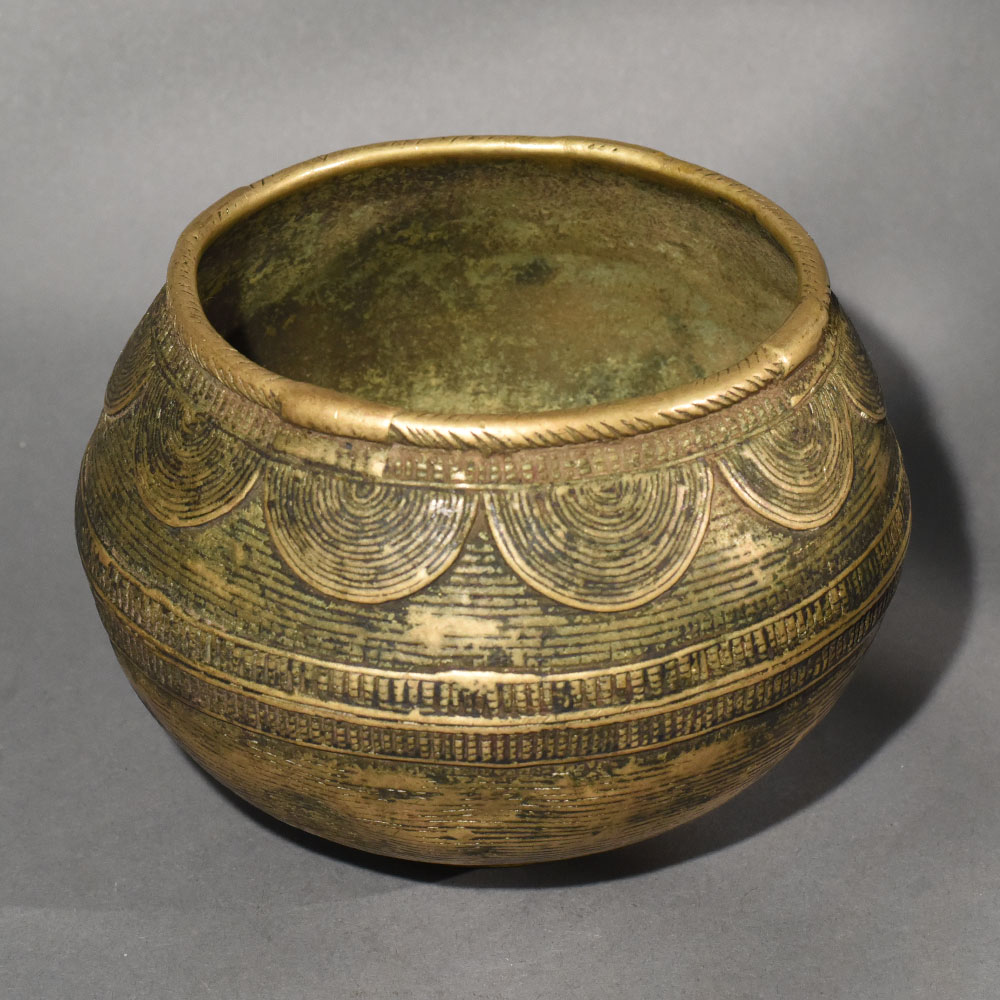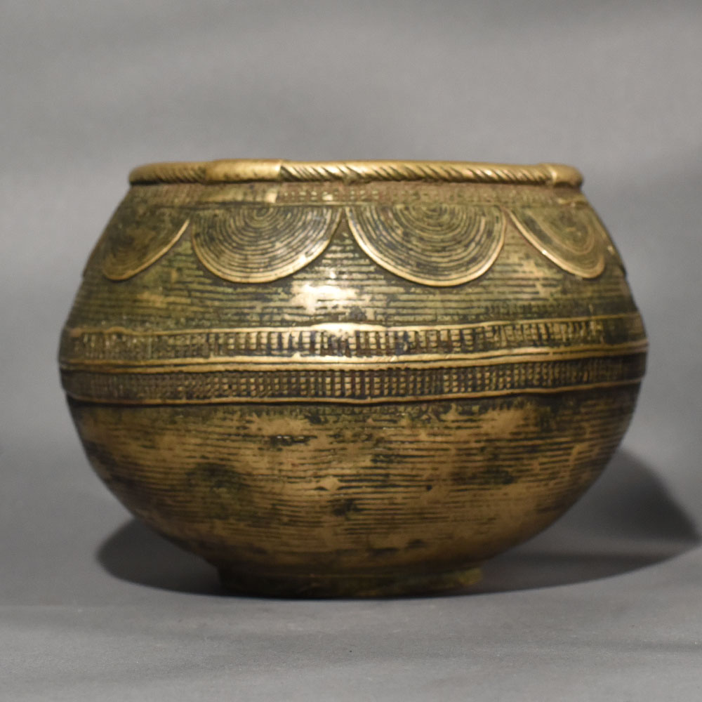This vintage brass rice measurement bowl from Odisha is a fine example of traditional Indian utilitarian craft, where everyday objects were shaped with both function and artistic expression in mind. Historically used in households and local markets, such bowls served as standardized measures for rice, grains, and pulses, essential staples in agrarian life. Crafted from solid brass, the vessel reflects the durability and cultural importance of metalware in eastern India. The bowl features a rounded, pot-like form with a wide mouth, allowing easy scooping and leveling of grains. Its exterior is richly decorated with engraved geometric and circular motifs arranged in horizontal bands, a design language commonly seen in Odishan brass work. The repeated arched patterns and linear textures create a rhythmic surface, giving the piece strong visual character while also aiding grip during use. The thick, rolled rim adds structural strength and emphasizes its practical origins. A naturally developed patina covers the surface, blending warm brass tones with darker, aged accents that speak to decades of handling and use. These surface variations enhance its authenticity and vintage appeal, making it equally suitable as a decorative object today. While it no longer needs to serve as a measuring tool, the bowl can be repurposed as a planter, storage vessel, or statement accent in traditional, rustic, or eclectic interiors. Beyond its functional past, this rice measurement bowl stands as a cultural artifact, reflecting Odishas rich craft traditions and the everyday rhythms of Indian domestic life. Its timeless form and handcrafted detailing make it appealing to collectors, designers, and those who appreciate heritage objects with history and character.