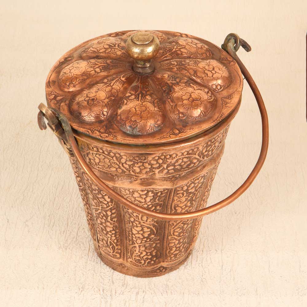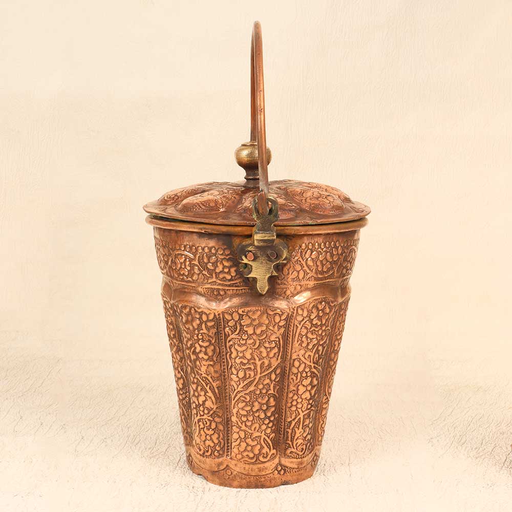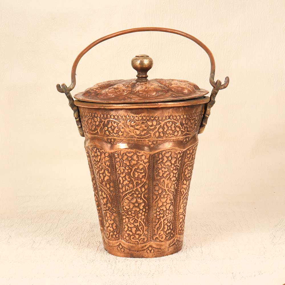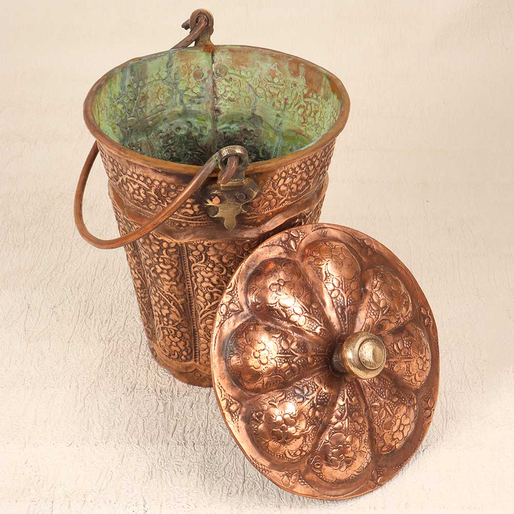 Add an elegant touch to your home decor with this stunning Vintage Copper Bucket engraved with intricate Islamic art. The hand-hammered bucket gleams with a warm copper patina, featuring an ornate pattern of geometric and floral motifs inspired by ancient Islamic design. This gorgeous bucket will be the focal point of any room. The detailed engraving showcases the fine artistry of the Islamic tradition, bringing a touch of history and culture to your home. Display it on a shelf, fill it with potpourri or bath salts, or let it bring an artistic flair to everyday storage needs. With its timeless elegance and artisanal quality, this engraved copper bucket makes a meaningful addition to any decor. Give your home an exotic accent piece that gets admired by all who see it. This bucket is ideal for anyone who appreciates Islamic art and wants to incorporate it into their home decor. The ornate engraving adds visual interest and gives your space an artful look and feel. Let this handcrafted piece spark conversations about its unique beauty and cultural style.