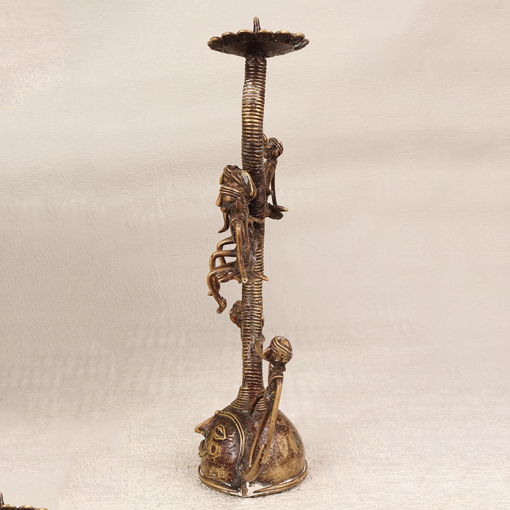 Decorate your home with our enchanting Vintage Brass Candle Stand that is a testament to the exquisite craftsmanship of professional artisans in Tribal Art. Handmade from premium brass, this tree-shaped stand boasts a rich antique brown finish, adding a touch of timeless elegance to any space. The intricately designed branches hold seven figures in serene poses, creating a captivating tableau reminiscent of cultural heritage. Perfect for special or auspicious occasions, this candle stand invites warmth and charm, making it an ideal centerpiece during family gatherings, intimate dinners, or celebrations with friends. Its versatile design suits various settings, enhancing the ambiance in homes, offices, restaurants, hotels, or cafes. Embrace the nostalgia of yesteryears by adding this piece to your vintage collection, or gift it to your loved ones on special, festive, or auspicious occasions.