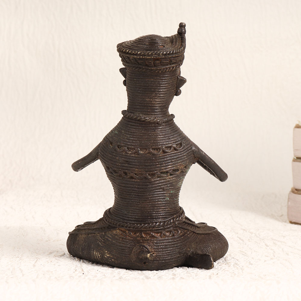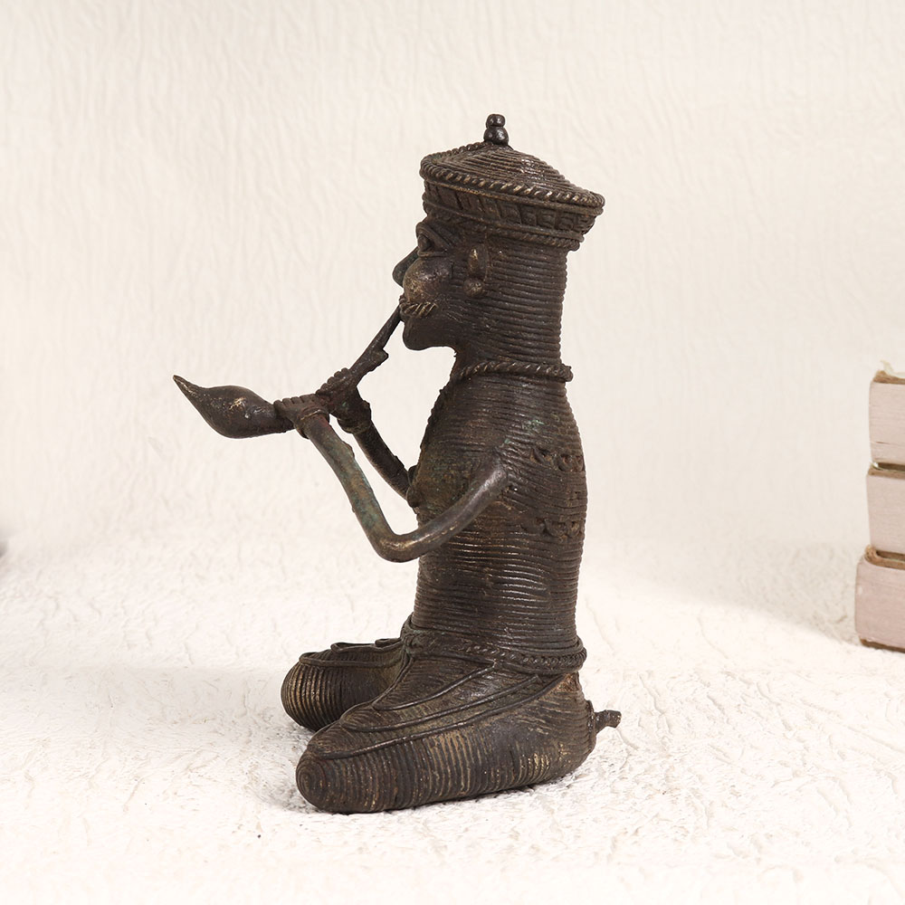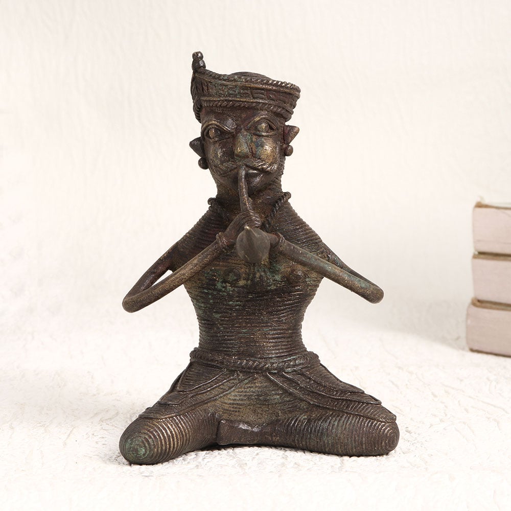 Adorn your interior with the mesmerizing charm of our Brass Snake Charmer Statue. Crafted with exquisite attention to detail, this stunning piece showcases a talented artisan's dedication to preserving tribal art traditions. Cast in high-quality brass and finished with an antique dark patina, it exudes an aura of timeless elegance. The statue portrays a skilled snake charmer in the midst of a captivating performance, skillfully playing the pungi, as if summoning a mystical connection between man and serpent. This captivating art piece is versatile, making it suitable for various settings, including your home, office, restaurant, hotel, cafe, or shop. It effortlessly complements both contemporary and vintage aesthetics, adding a touch of cultural richness to any space. Whether you're a collector seeking a unique addition or an exhibitor looking for an eye-catching display, this Brass Snake Charmer Statue promises to captivate the imagination. Moreover, it makes for a thoughtful gift on special, festive, or auspicious occasions, symbolizing the artistry, tradition, and mystique of a bygone era.