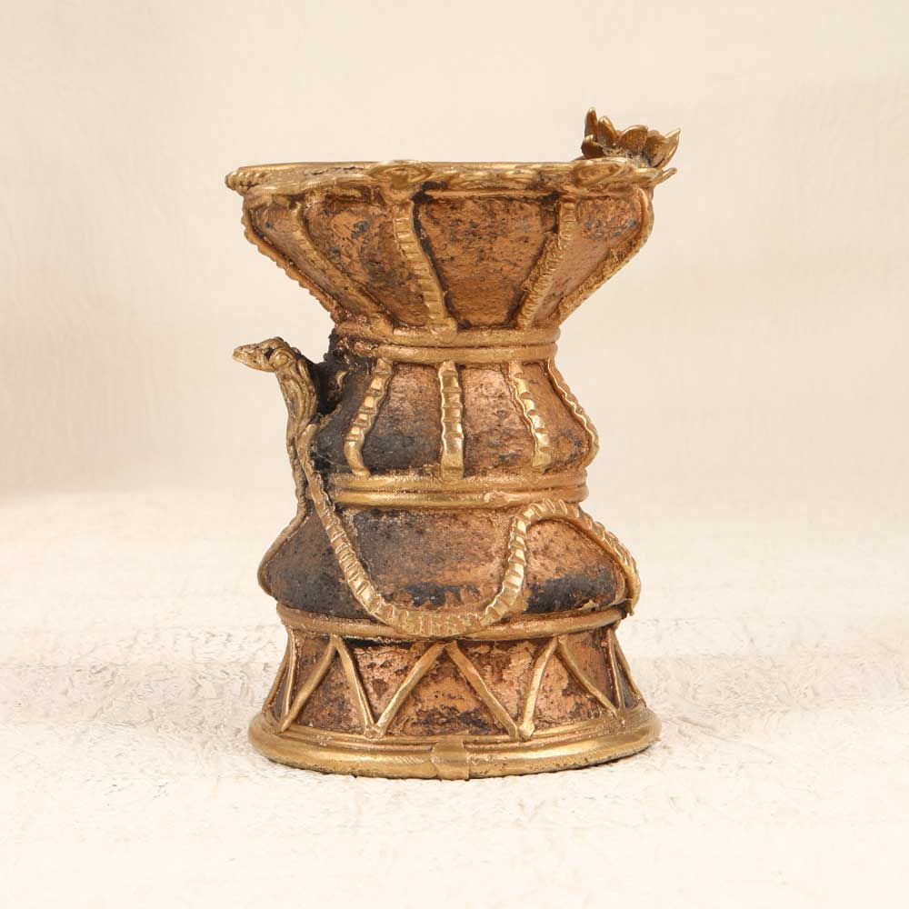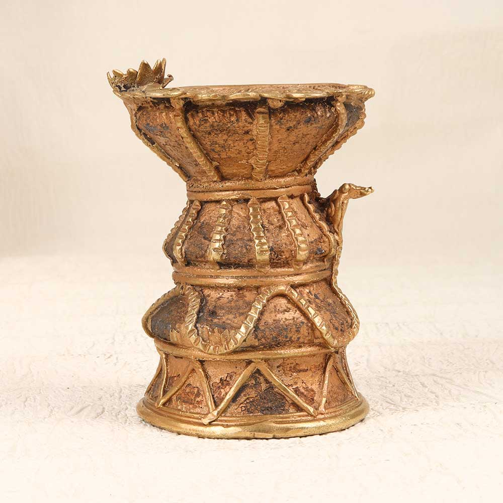 Shine a light on old-world charm with this vintage brass oil lamp. Beautifully crafted with intricate cobra engravings in a brown Tribal Art finish, this lamp brings exotic elegance to any space. Bask in the warm, flickering glow of lamp light like days gone by. Unlike harsh modern lighting, the soft ambiance of this brass oil lamp creates a relaxed, welcoming atmosphere. The hand-engraved cobra design adds an exotic accent that sparks conversation. With simple kerosene fuel, you can enjoy this light anywhere, from the patio to the bedroom. For those who appreciate old-world charm and want to infuse their home with vintage style, this tribal engraved brass lamp makes a stunning decorative accent. The old-fashioned lighting transforms any corner into a cozy retreat.