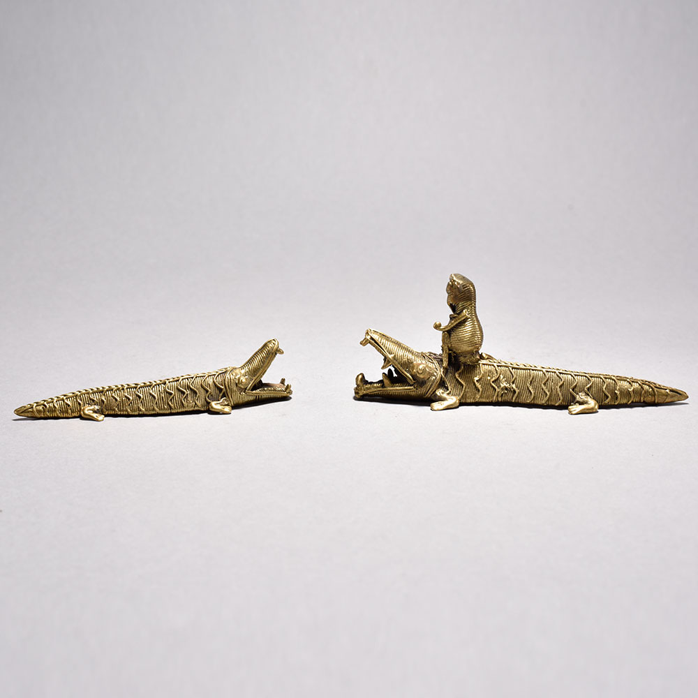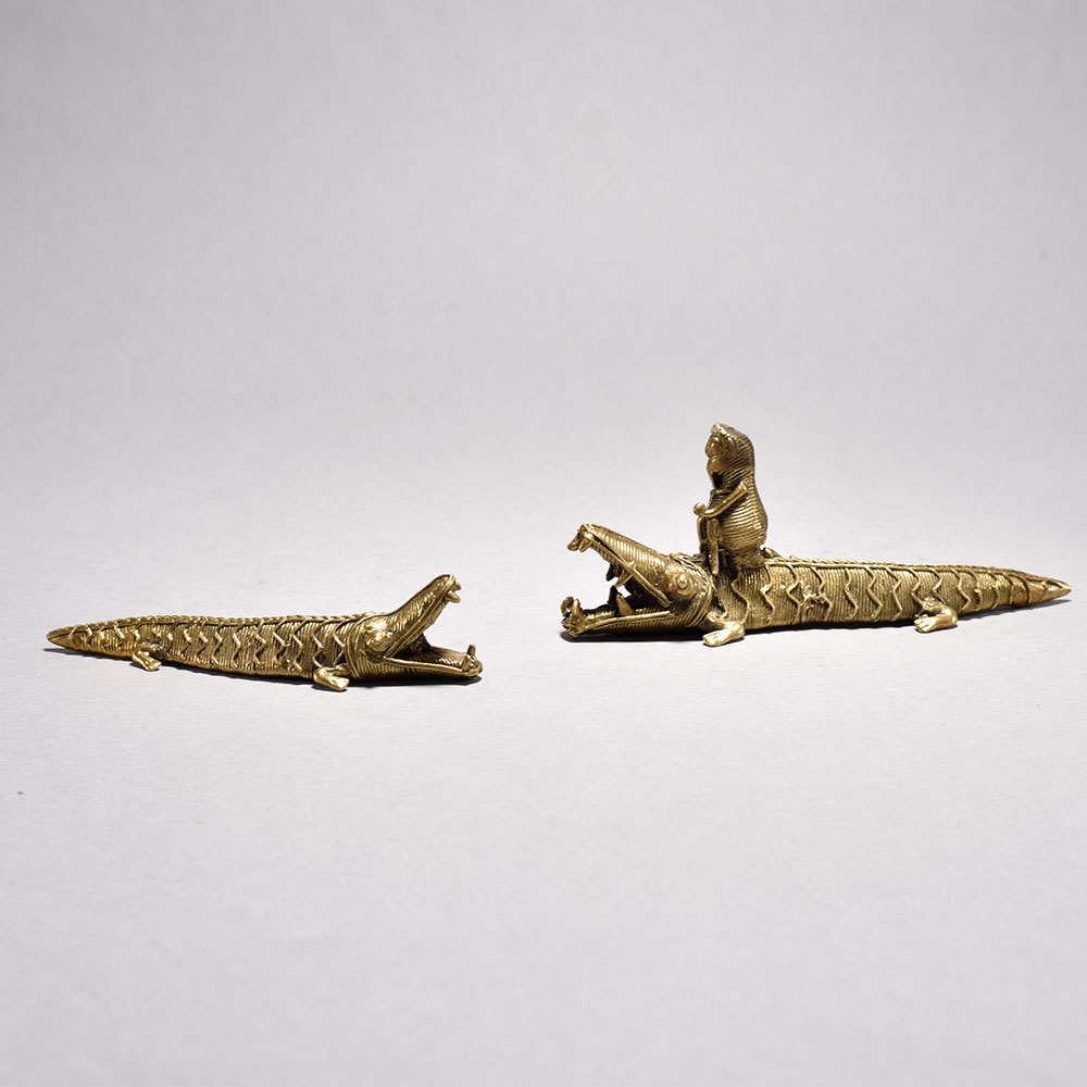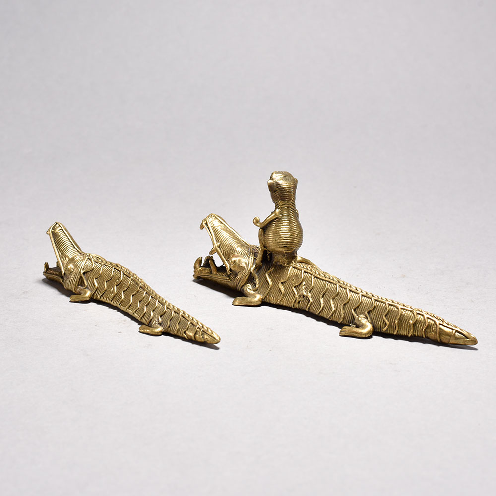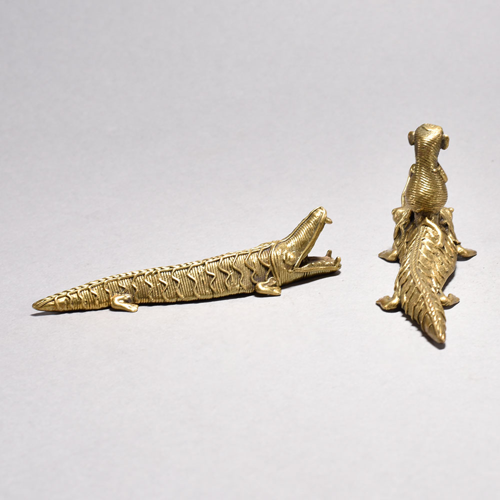 Unleash the captivating power of the wild with this stunning tribal art crocodile pair Featuring a larger crocodile with a small monkey figurine perched atop its back, this unique piece is a mesmerizing display of nature's harmony.Imagine the intricate dance of predator and prey, captured in stunning metal form. This tribal art figurine brings the untamed beauty of the wild into your home, adding a captivating touch of cultural flair to any space. Whether you're a collector of fine art or simply seeking a unique conversation piece, this crocodile pair with a monkey companion is sure to mesmerize all who behold it. Handcrafted metal crocodile pair with open mouths This timeless piece is handcrafted by skilled artisans using time-honored techniques, ensuring each creation is truly one of a kind. Its versatile design makes it suitable for living rooms, bedrooms, offices, or meditation spaces, bringing a sense of heritage and style wherever it is displayed.