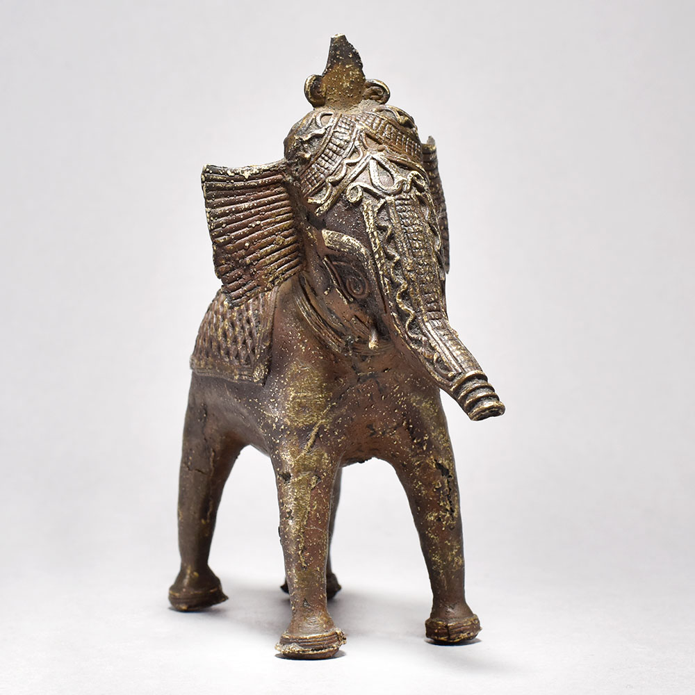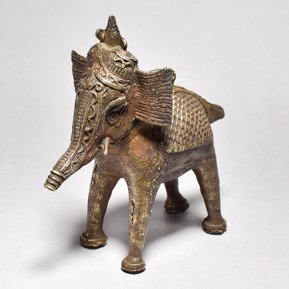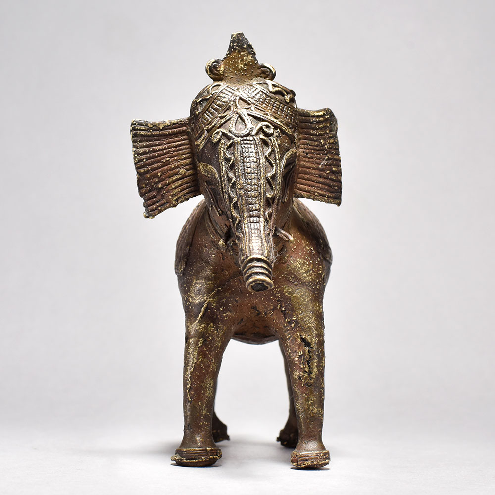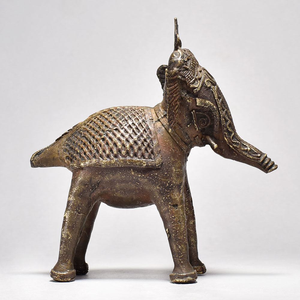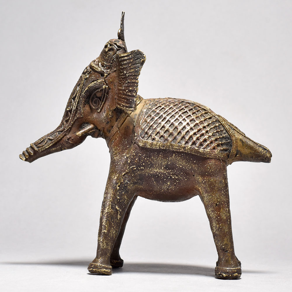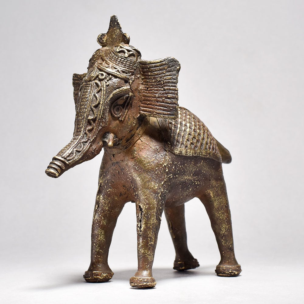 Bring home a piece of ancient Orissan artistry with this striking Tribal Elephant Figurine.This bold, brass elephant figurine is more than just a decoration - it's a work of art that tells a story. Inspired by the tribal traditions of Orissa, each piece is meticulously handcrafted to capture the essence of these magnificent creatures. The half-raised trunk is a symbolic gesture, imbuing the elephant with a sense of power and regal presence. Display this stunning figurine in your home to bring the mystique of ancient India into your everyday life. Handcrafted from solid brass Tribal design with half trunk raised in a symbolic gesture Unique, one-of-a-kind piece from India's rich artistic heritage Adds an exotic, worldly touch to any space This unique handcrafted piece is a testament to traditional artistry, blending functionality with beauty and making it a treasured collectible for years to come.