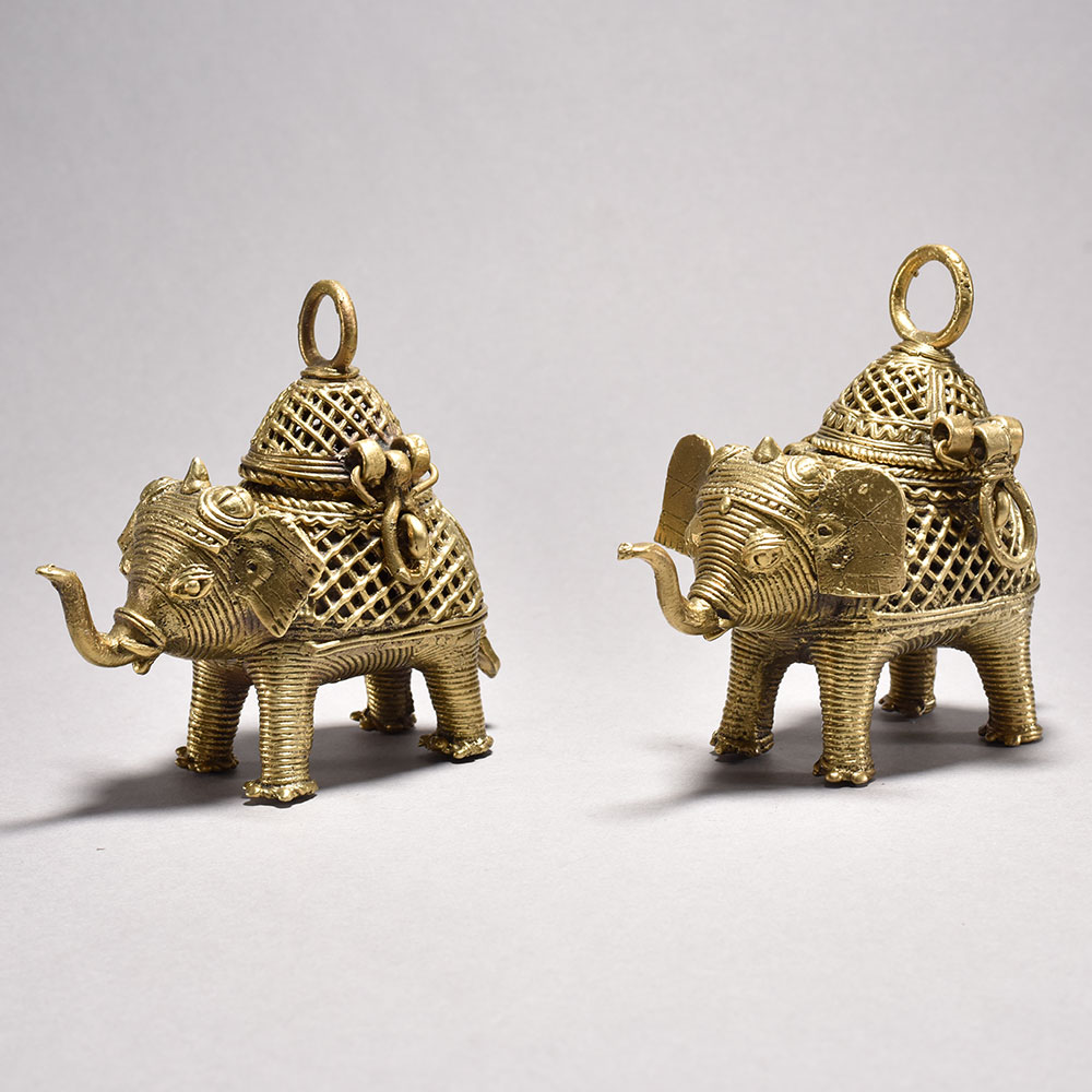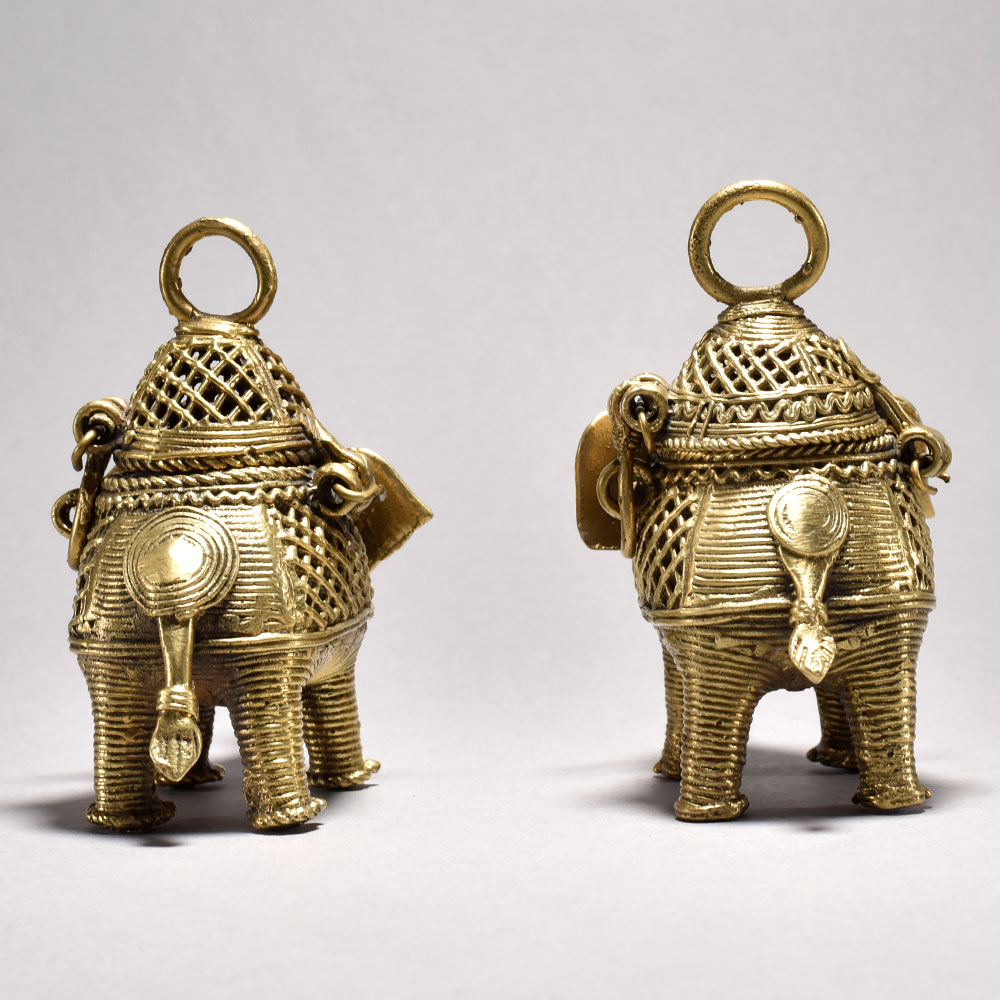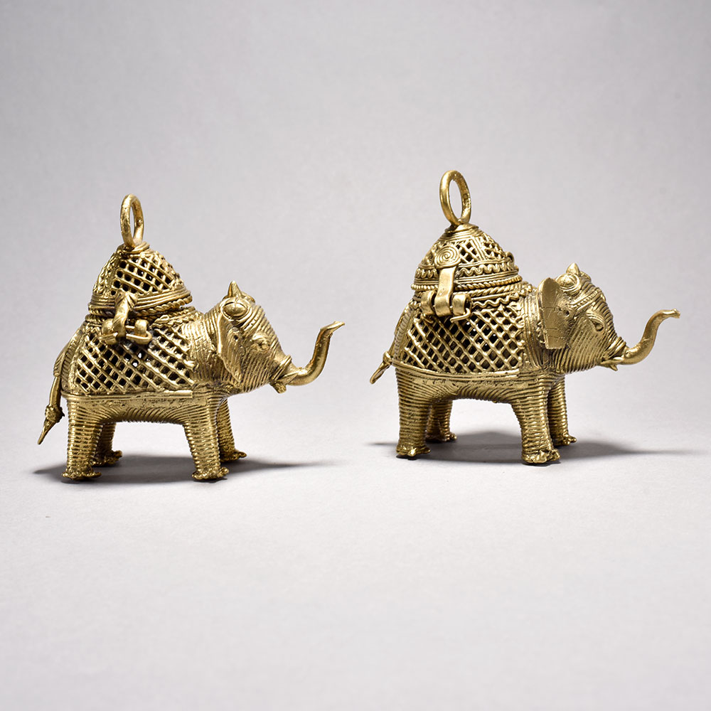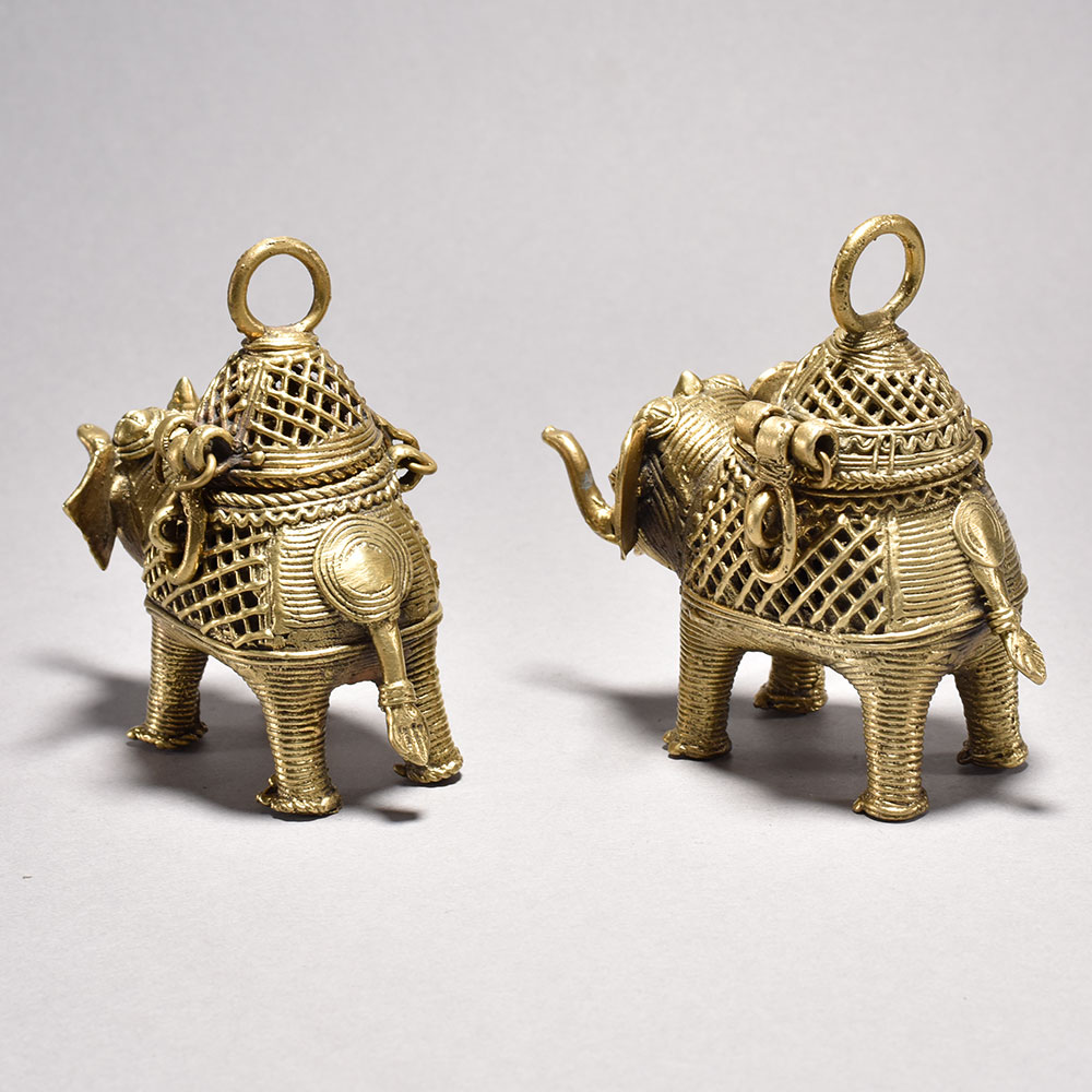 Bring the timeless beauty of Orissa's tribal art into your home with this stunning pair of metal elephants. Crafted through the intricate lost wax casting process, each majestic figure features an ornate, decorative box perched atop its back, showcasing the incredible attention to detail in the jalli-style metalwork.These magnificent elephant sculptures embody the rich cultural heritage of India's tribal communities. Display this captivating pair in your home to infuse your space with the beauty and wonder of Orissa's time-honored artistry. An exquisite addition to any room, these elephants are sure to spark conversation and delight all who behold them. Handmade metal tribal art elephants from Orissa This timeless piece is handcrafted by skilled artisans using time-honored techniques, ensuring each creation is truly one of a kind. Its versatile design makes it suitable for living rooms, bedrooms, offices, or meditation spaces, bringing a sense of heritage and style wherever it is displayed.