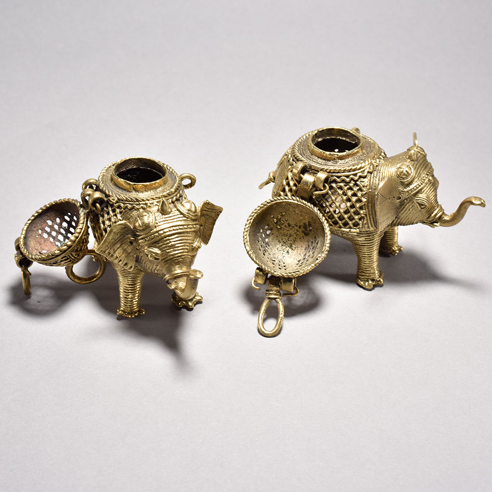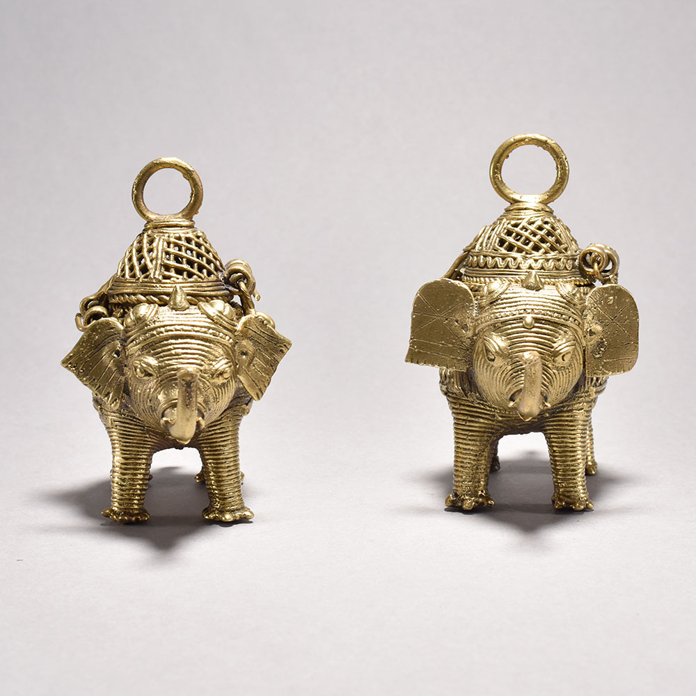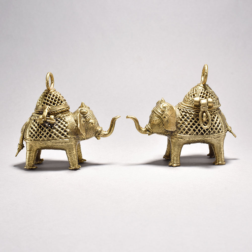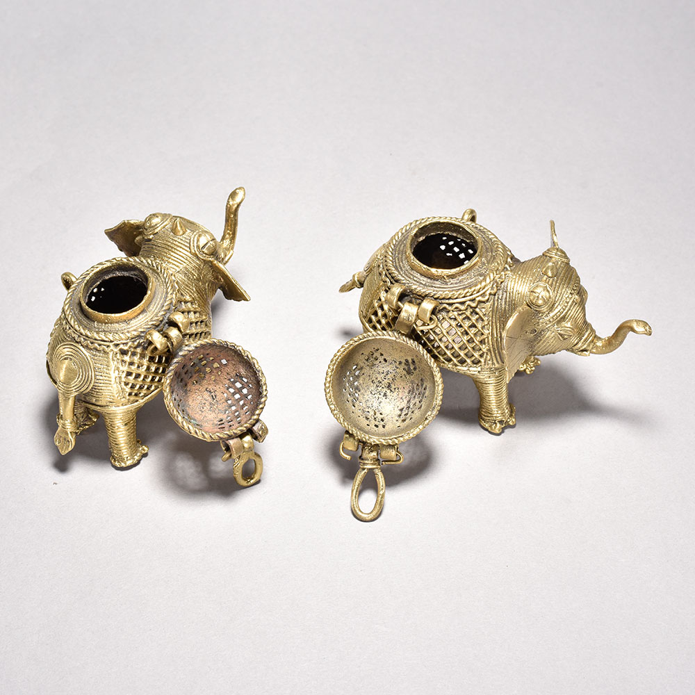 Bring the timeless beauty of Orissa's tribal art into your home with this stunning pair of metal elephants. Crafted through the intricate lost wax casting process, each majestic figure features an ornate, decorative box perched atop its back, showcasing the incredible attention to detail in the jalli-style metalwork.These magnificent elephant sculptures embody the rich cultural heritage of India's tribal communities. Display this captivating pair in your home to infuse your space with the beauty and wonder of Orissa's time-honored artistry. An exquisite addition to any room, these elephants are sure to spark conversation and delight all who behold them. Handmade metal tribal art elephants from Orissa This timeless piece is handcrafted by skilled artisans using time-honored techniques, ensuring each creation is truly one of a kind. Its versatile design makes it suitable for living rooms, bedrooms, offices, or meditation spaces, bringing a sense of heritage and style wherever it is displayed.