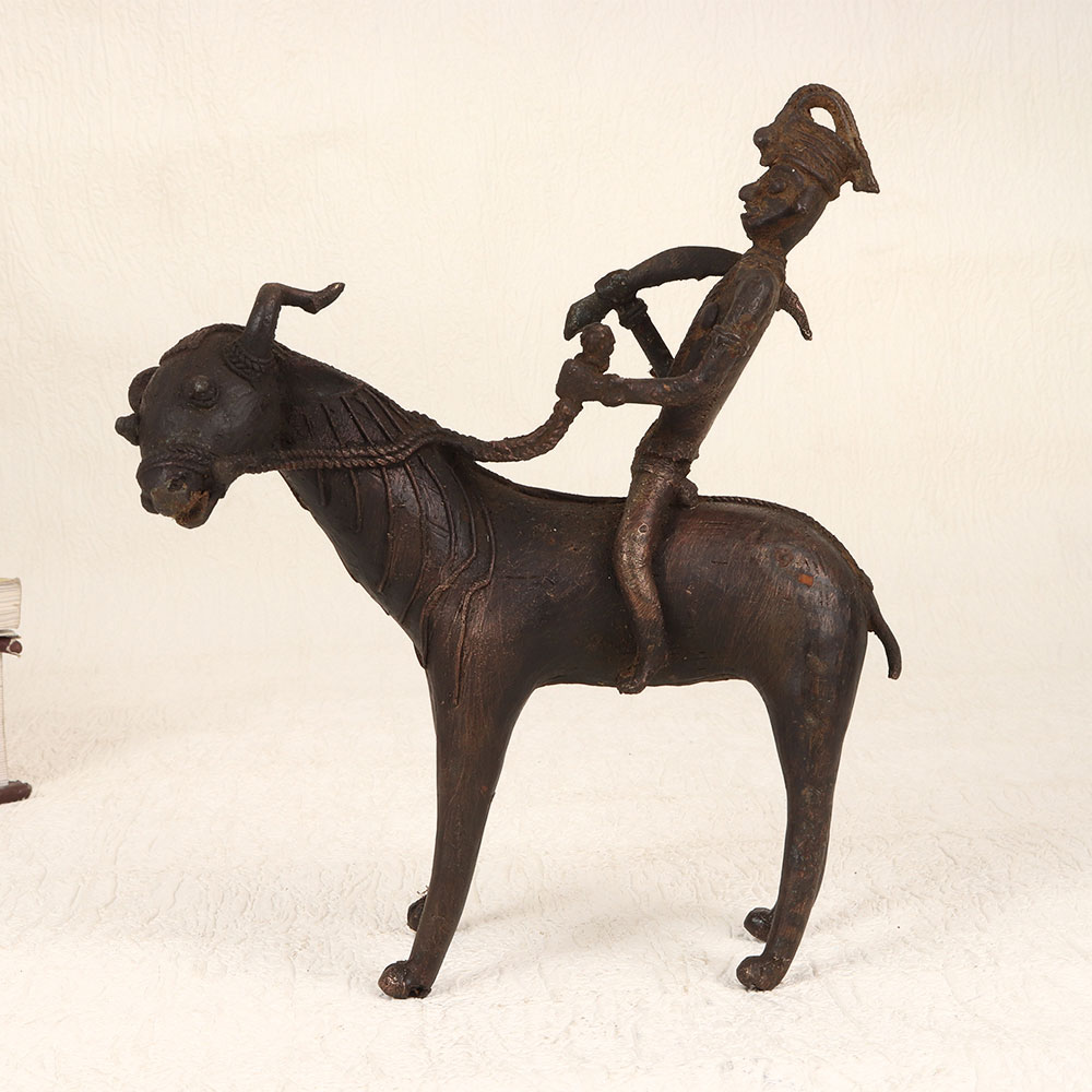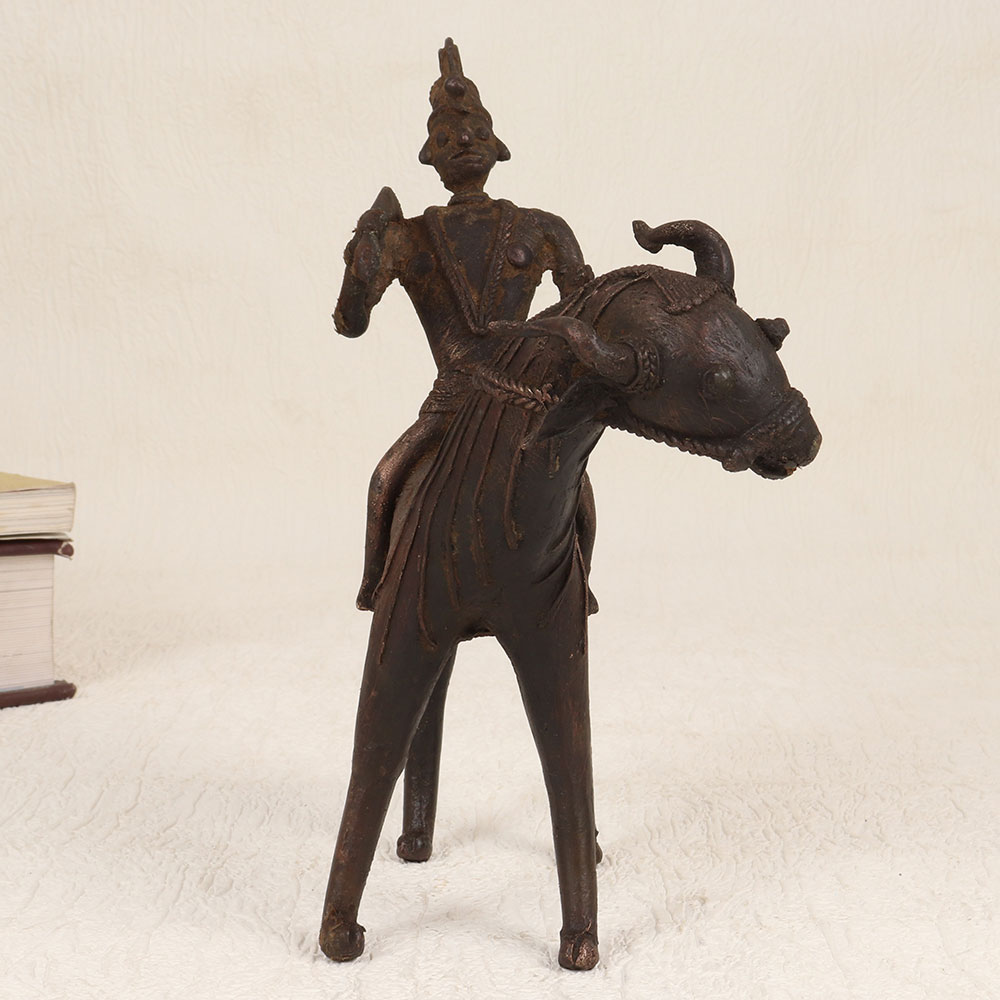 This Vintage Brass Goat with Rider stands as a testament to the exquisite craftsmanship of highly skilled Indian artisans from Bengal. Meticulously handmade from high-quality brass, this unique creation boasts a dark finish that adds a touch of mystique to its vintage charm. The intricately designed brass goat, adorned with tribal motifs, carries a rider, showcasing a seamless blend of traditional art and skilled metalwork. Versatile in its appeal, this masterpiece is a perfect addition to diverse settings, be it at home, office, restaurant, hotel, or cafe, enhancing the ambiance with its cultural allure. A true collector's gem, this vintage brass sculpture invites admiration for its historical resonance and aesthetic appeal. It serves as an ideal gift for loved ones on special, festive, or auspicious occasions, carrying with it the rich heritage and artistic finesse of Bengal's master craftsmen.