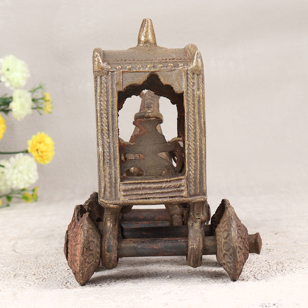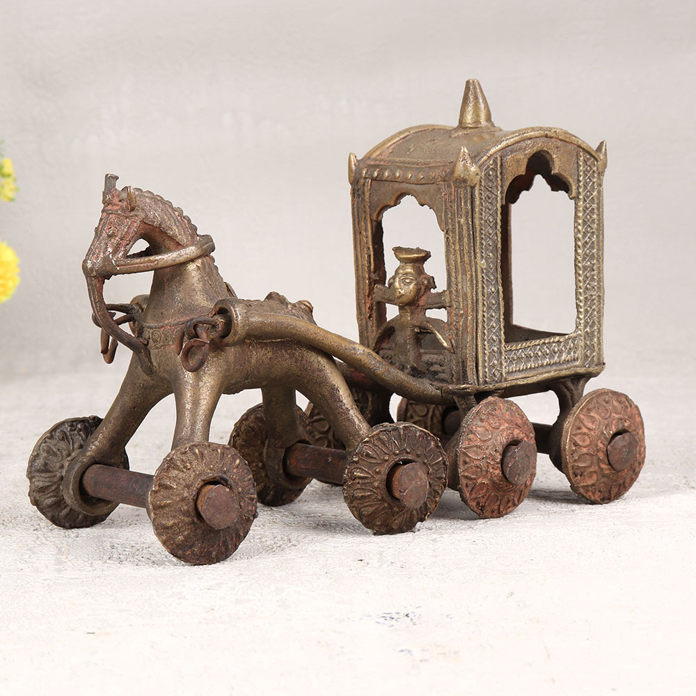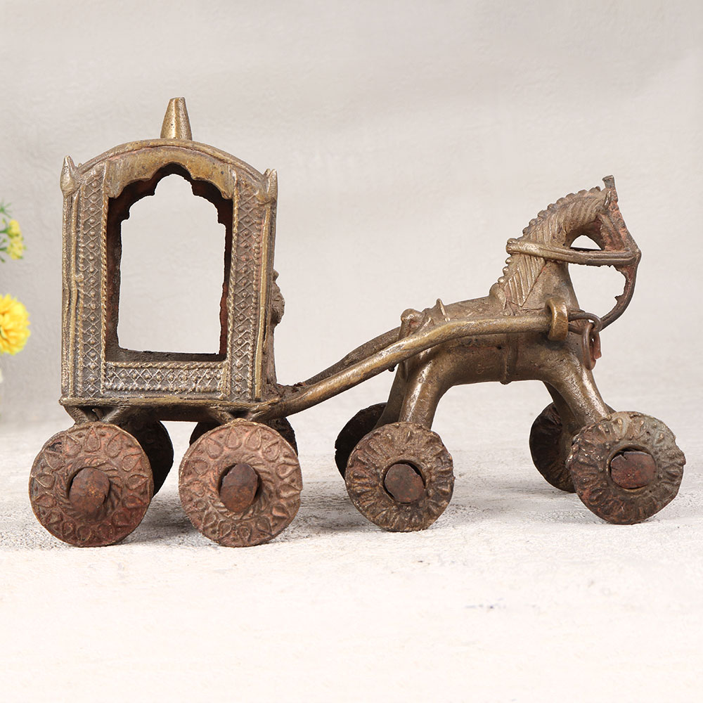 Adorn your home interior with the timeless allure of our exquisite Brass Horse Chariot Statue. This stunning piece captures the essence of antiquity, featuring a majestic horse pulling a four-wheeled chariot, with a skilled rider nestled within. Handcrafted by highly skilled and experienced Indian artisans in Tribal Art, the statue boasts a rich antique brown finish that adds a touch of vintage elegance to any space. Crafted from high-quality brass, the meticulous detailing and craftsmanship bring this piece to life, showcasing the artisan’s dedication to their craft. The statue's versatility allows it to grace various settings, be it your home, office, restaurant, hotel, or cafe, enhancing the ambiance with its regal presence. This masterpiece not only serves as a captivating decoration but also makes for a unique addition to any vintage collection. Consider it as a thoughtful gift for your loved ones on special, festive, or auspicious occasions.