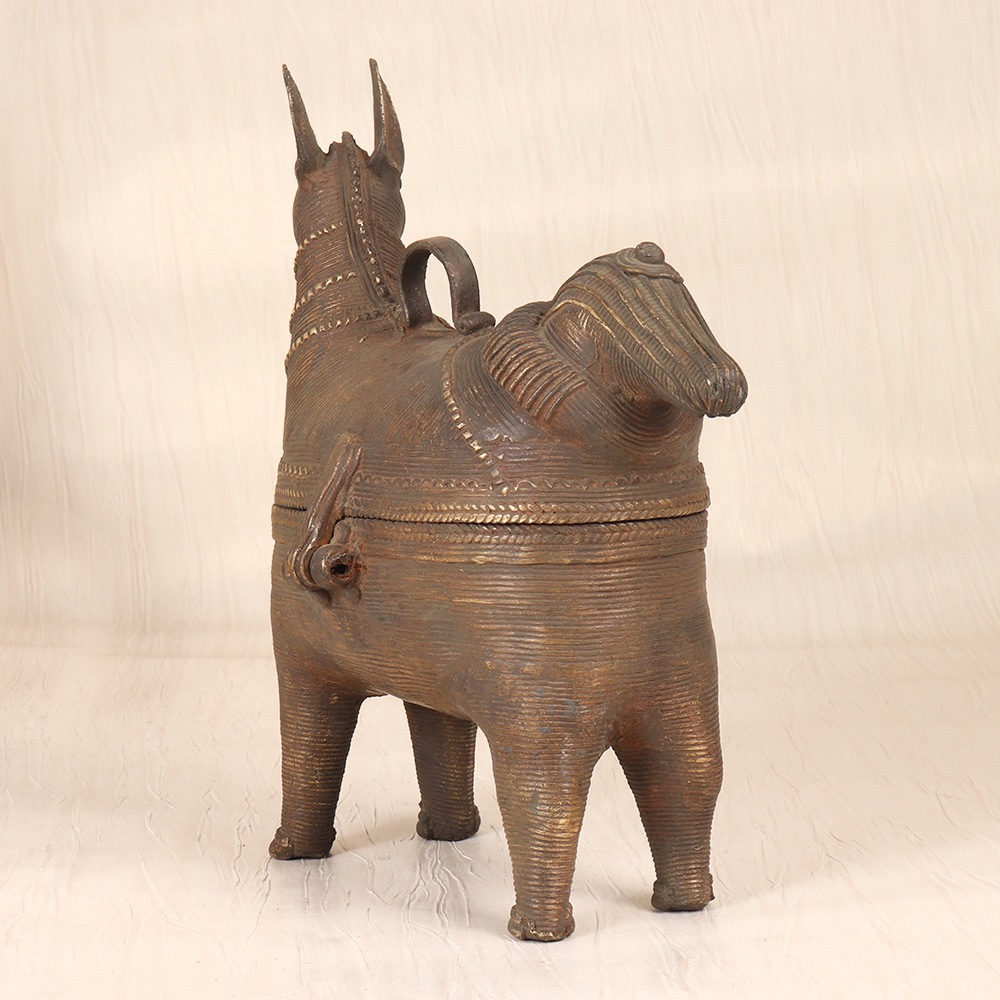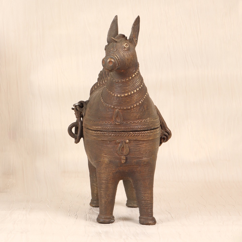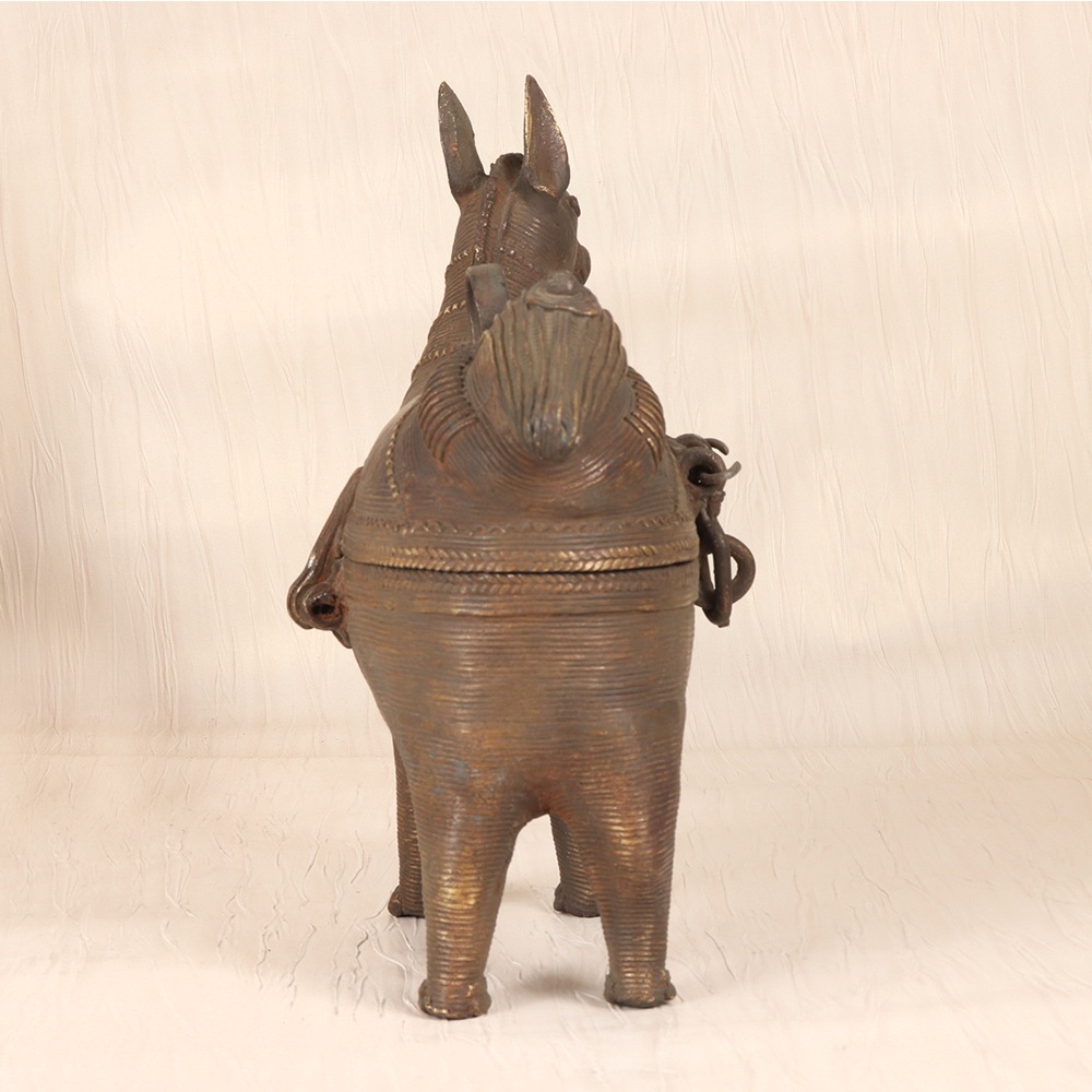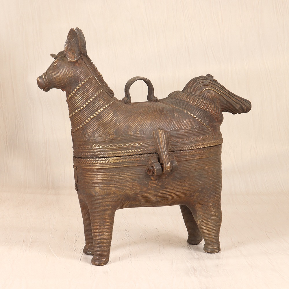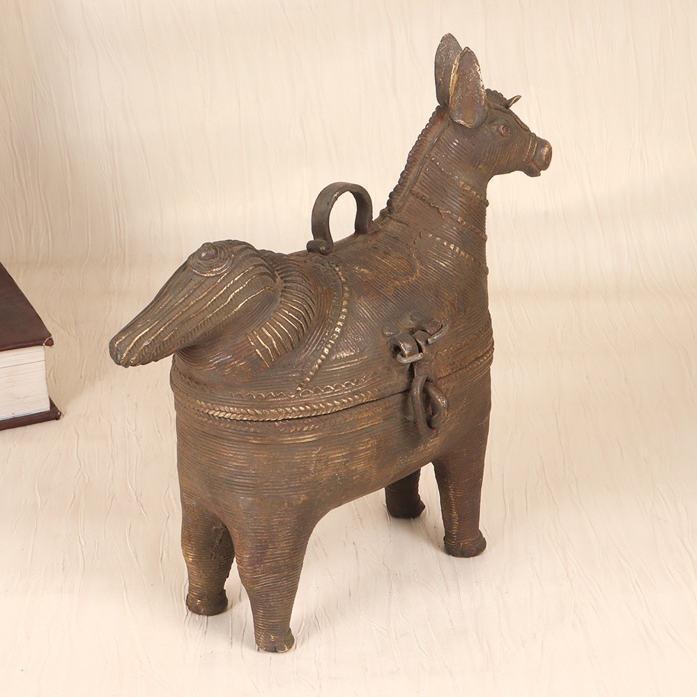 Unlock the secrets of your most cherished jewelry with this exquisite brass jewelry box. Meticulously crafted by skilled artisans in the heart of Odisha, India, this piece is a stunning representation of the region's vibrant Tribal Art traditions. The intricate horse head design on the lid is more than just a beautiful accent - it symbolizes strength, power, and the unbridled spirit of the artisans who poured their passion into every detail. Whether you're looking to elevate your personal jewelry collection or seeking a thoughtful gift for a loved one, this vintage-inspired brass box is sure to captivate. Its spacious interior features multiple compartments, allowing you to neatly organize your rings, necklaces, earrings, and more. The durable brass construction ensures this heirloom-quality piece will withstand the test of time, becoming a treasured part of your daily routine for years to come.