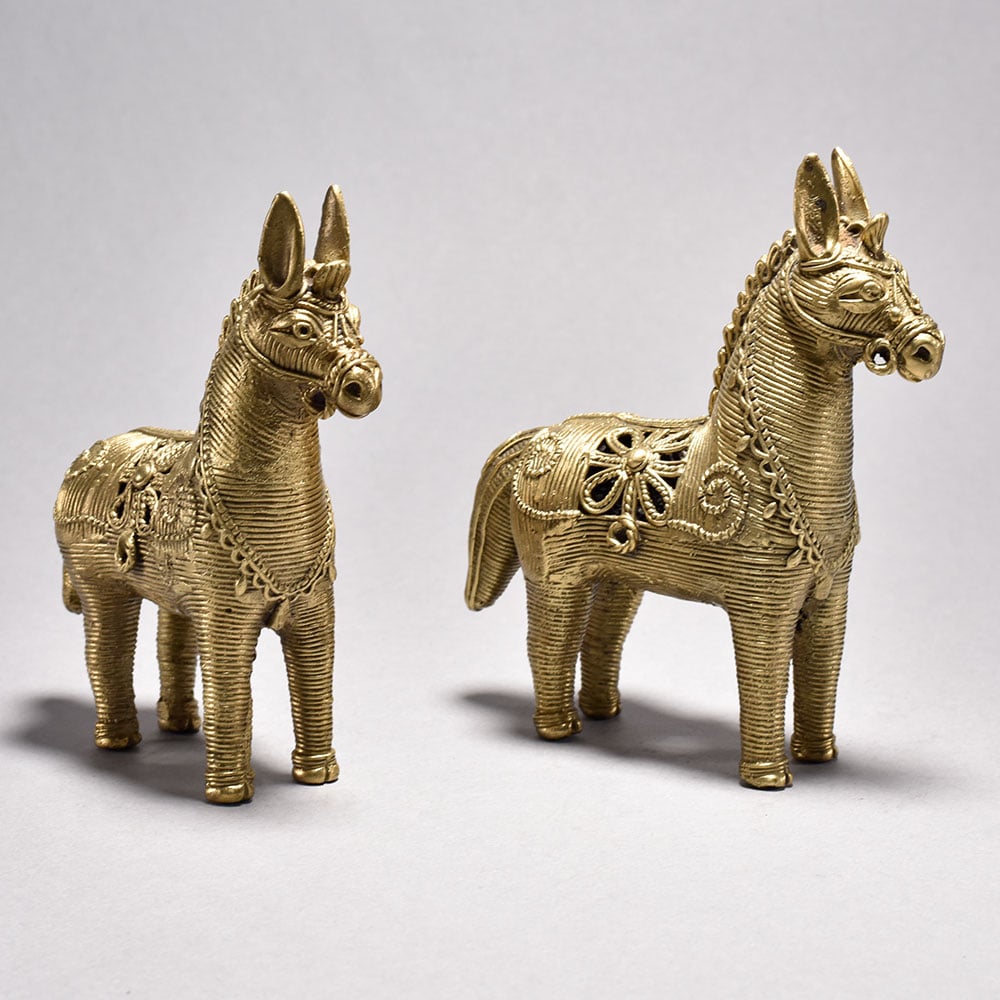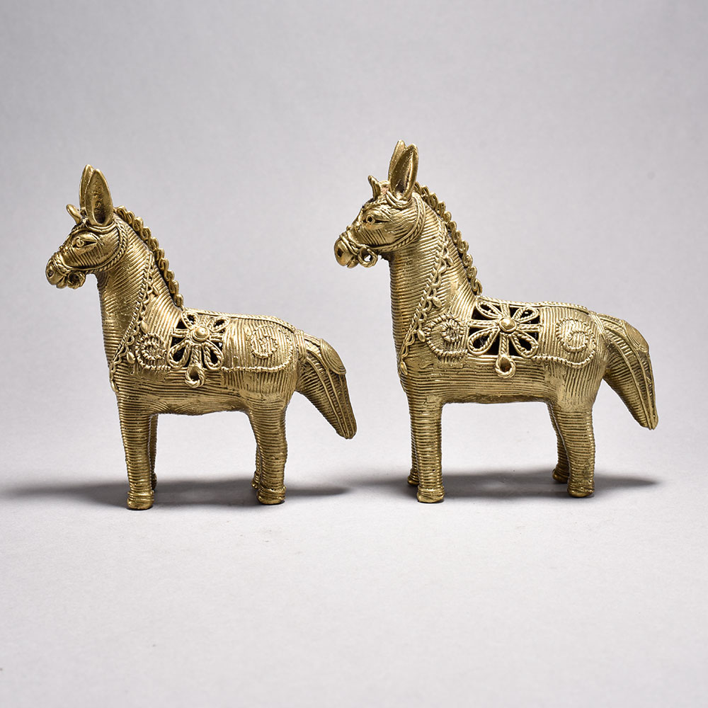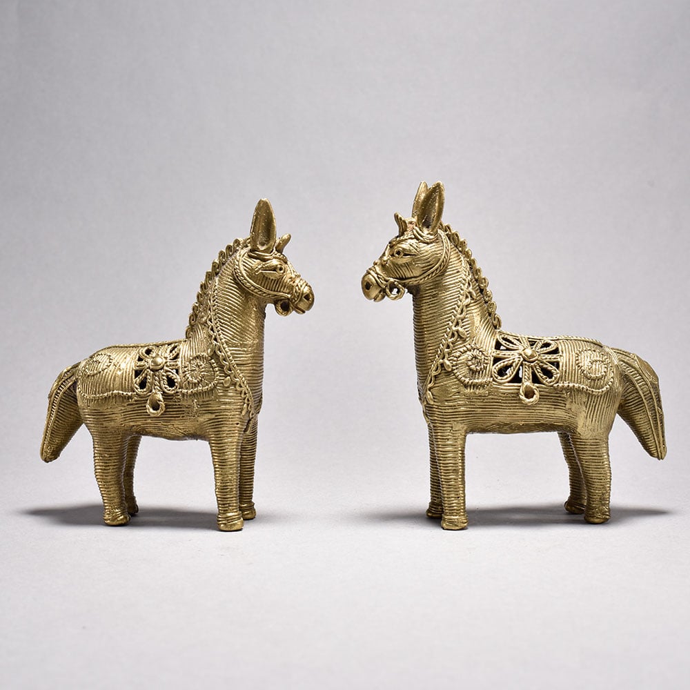 Elevate your home with the captivating beauty of our Tribal Art Horse Pair featuring intricate jali work.These stunning metal horses are a testament to the rich cultural heritage of India's tribal artisans. The delicate jali work, a technique of intricate perforated design, adds an exquisite level of detail that catches the eye and captivates the senses. Whether placed on a mantel, side table, or bookshelf, this artful pair will infuse your space with a sense of timeless, global flair. Handcrafted from fine metal in the artistic tradition of Orissa This timeless piece is handcrafted by skilled artisans using time-honored techniques, ensuring each creation is truly one of a kind. Its versatile design makes it suitable for living rooms, bedrooms, offices, or meditation spaces, bringing a sense of heritage and style wherever it is displayed. This timeless piece is handcrafted by skilled artisans using time-honored techniques, ensuring each creation is truly one of a kind. Its versatile design makes it suitable for living rooms, bedrooms, offices, or meditation spaces, bringing a sense of heritage and style wherever it is displayed.