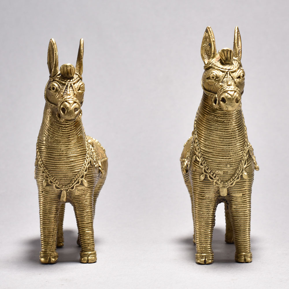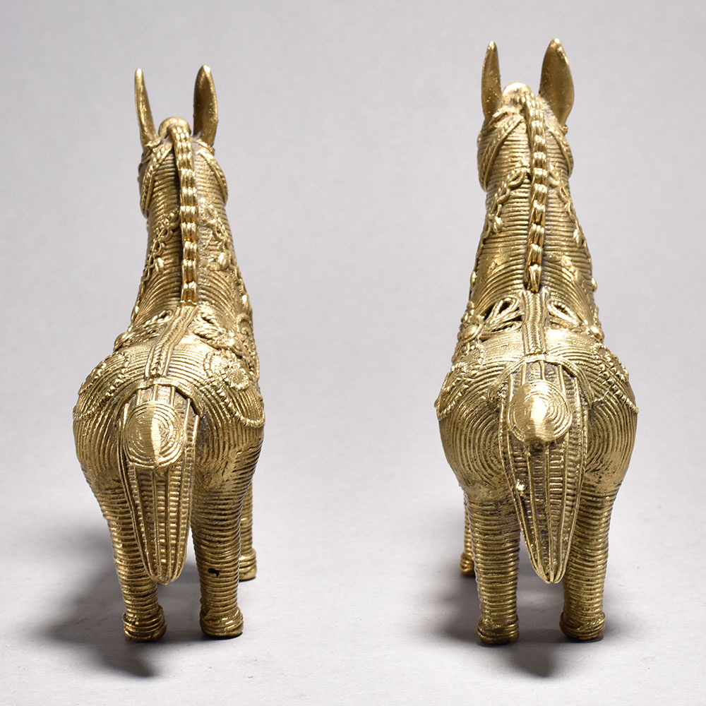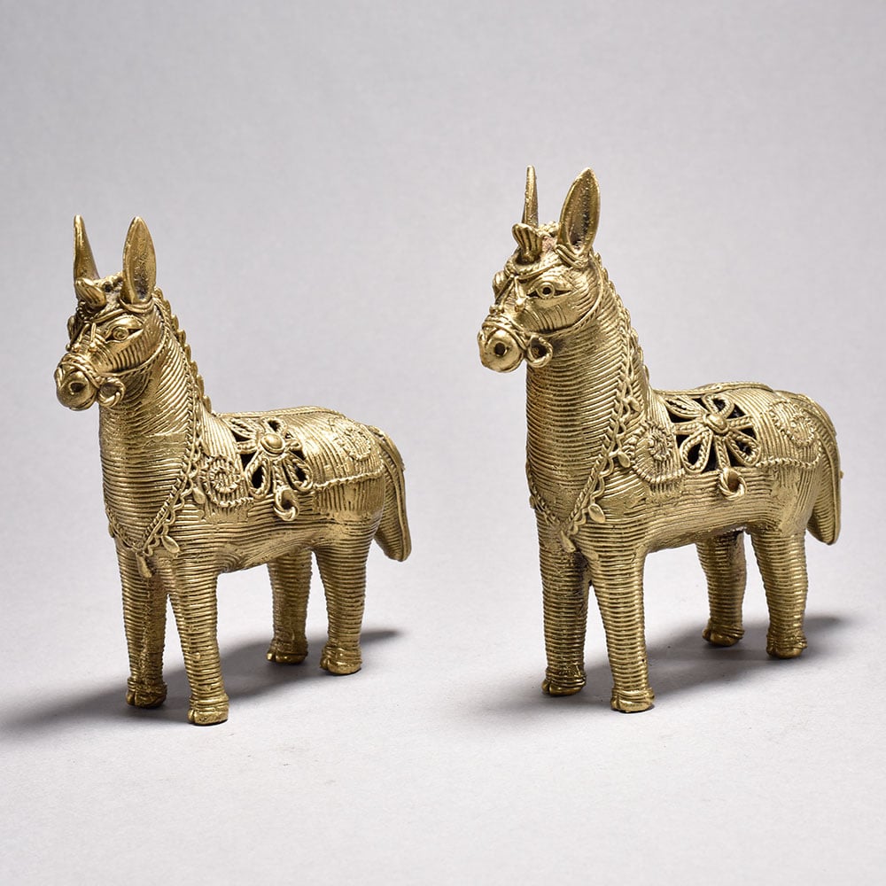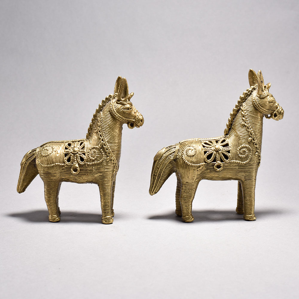 Elevate your home with the captivating beauty of our Tribal Art Horse Pair featuring intricate jali work.These stunning metal horses are a testament to the rich cultural heritage of India's tribal artisans. The delicate jali work, a technique of intricate perforated design, adds an exquisite level of detail that catches the eye and captivates the senses. Whether placed on a mantel, side table, or bookshelf, this artful pair will infuse your space with a sense of timeless, global flair. Handcrafted from fine metal in the artistic tradition of Orissa This timeless piece is handcrafted by skilled artisans using time-honored techniques, ensuring each creation is truly one of a kind. Its versatile design makes it suitable for living rooms, bedrooms, offices, or meditation spaces, bringing a sense of heritage and style wherever it is displayed. This timeless piece is handcrafted by skilled artisans using time-honored techniques, ensuring each creation is truly one of a kind. Its versatile design makes it suitable for living rooms, bedrooms, offices, or meditation spaces, bringing a sense of heritage and style wherever it is displayed.
