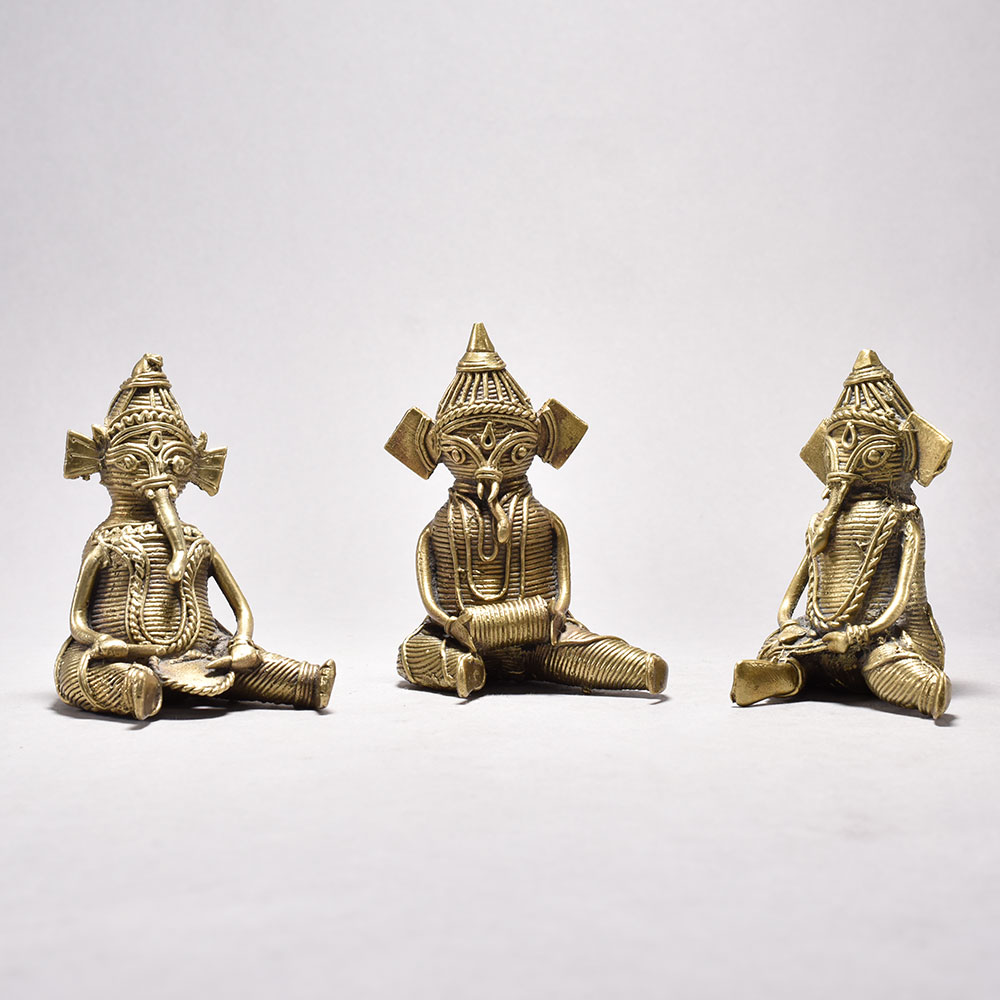 Elevate your home with the mesmerizing Tribal Art Lord Ganesha Set of 3.Bring the enchanting spirit of India into your space with this captivating trio of Lord Ganesha figurines. Crafted with exquisite attention to detail, each deity is uniquely depicted playing a different musical instrument, creating a harmonious symphony that will transport you to the heart of tribal culture. Display this breathtaking set as a stunning centerpiece or give it as a meaningful gift that celebrates the divine and the artistry of India's heritage. This Tribal Art Lord Ganesha Set is perfect for those who appreciate the beauty of traditional craftsmanship and seek to infuse their home with the sacred and the sublime. Let these three deities grace your space, filling it with the joyful melodies of India's timeless traditions. Meticulously handcrafted from fine Orissa metal This timeless piece is handcrafted by skilled artisans using time-honored techniques, ensuring each creation is truly one of a kind. Its versatile design makes it suitable for living rooms, bedrooms, offices, or meditation spaces, bringing a sense of heritage and style wherever it is displayed.