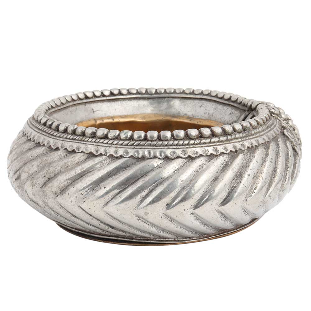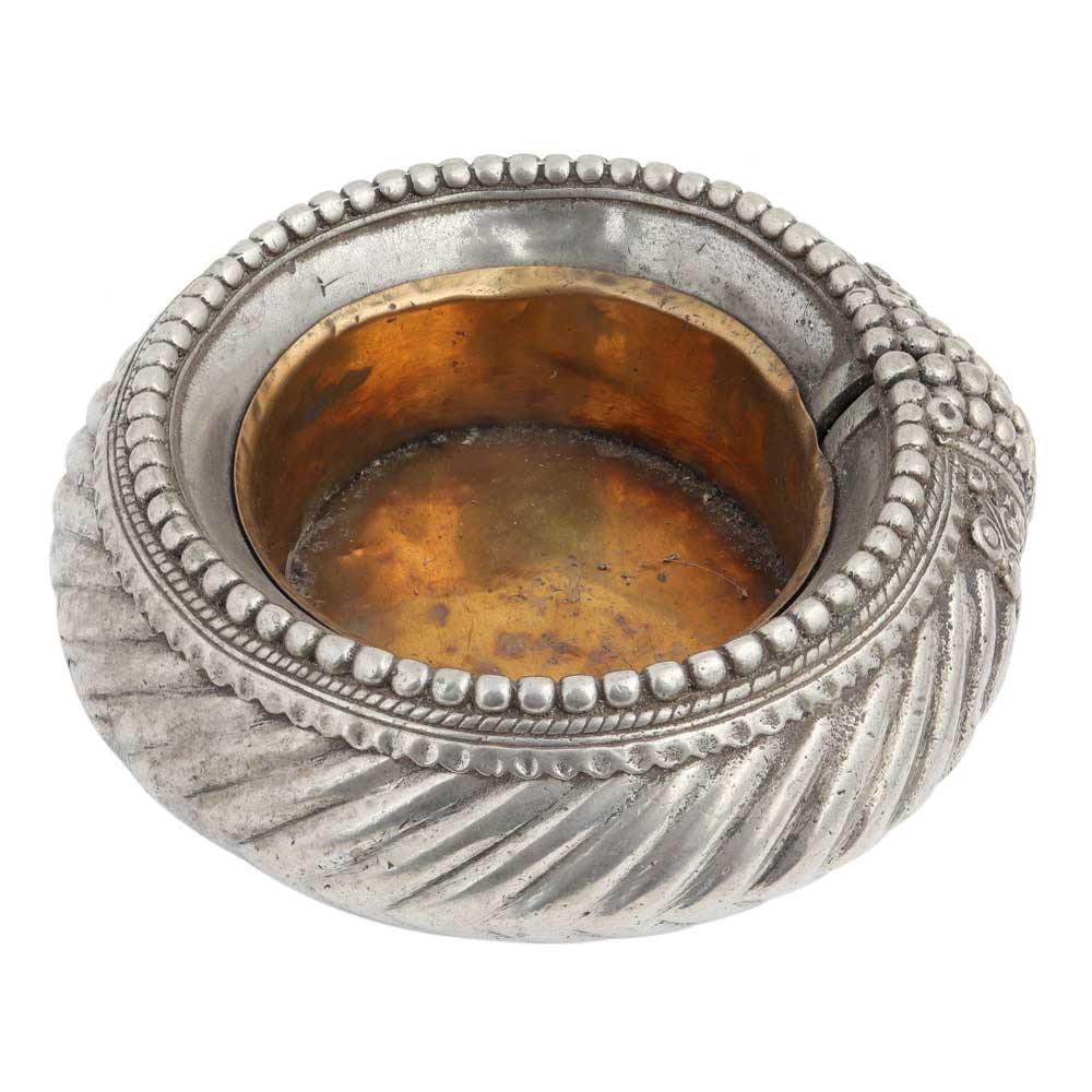 Tribal Hand made Brass Ashtray Spirally Carved Design and small pearls on the edge. Used to store ash , showpiece for the centre table, bar area, hotel, restaurant, clubs , wedding, birthday, new year gift , birthday gift for your near and dear ones. It comes with a lovely silver finish.