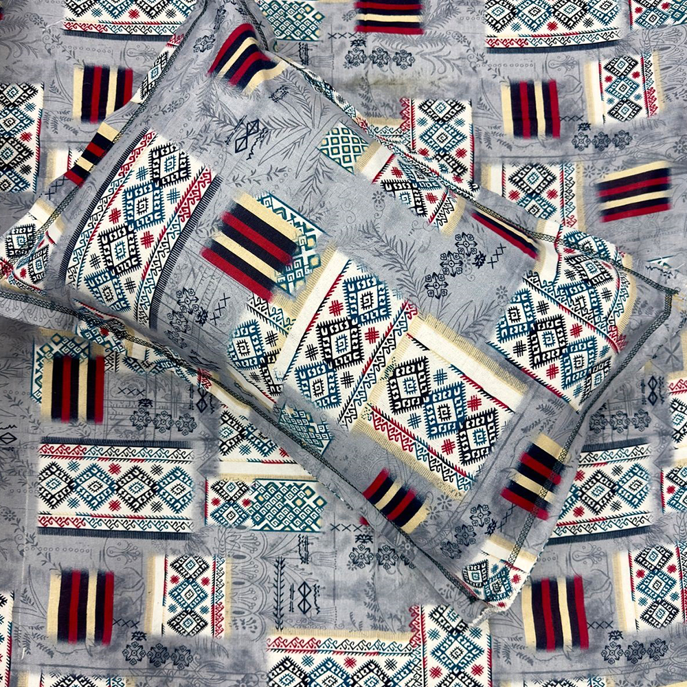Add a bold cultural statement to your bedroom with this Tribal Motif Print King Size Bedsheet Set. Featuring a vibrant mix of traditional tribal-inspired patterns in red, navy, ivory, and teal on a soft grey background, this design brings heritage charm with a modern twist. Made from 100% pure cotton casement, it offers breathability, softness, and a neat, wrinkle-free finish.This 3-piece set includes one flat (non-fitted) king-size bedsheet and two matching pillow covers, making it a perfect choice for those who appreciate unique patterns and global aesthetics. Ideal for gifting or upgrading your personal space with ethnic flair.