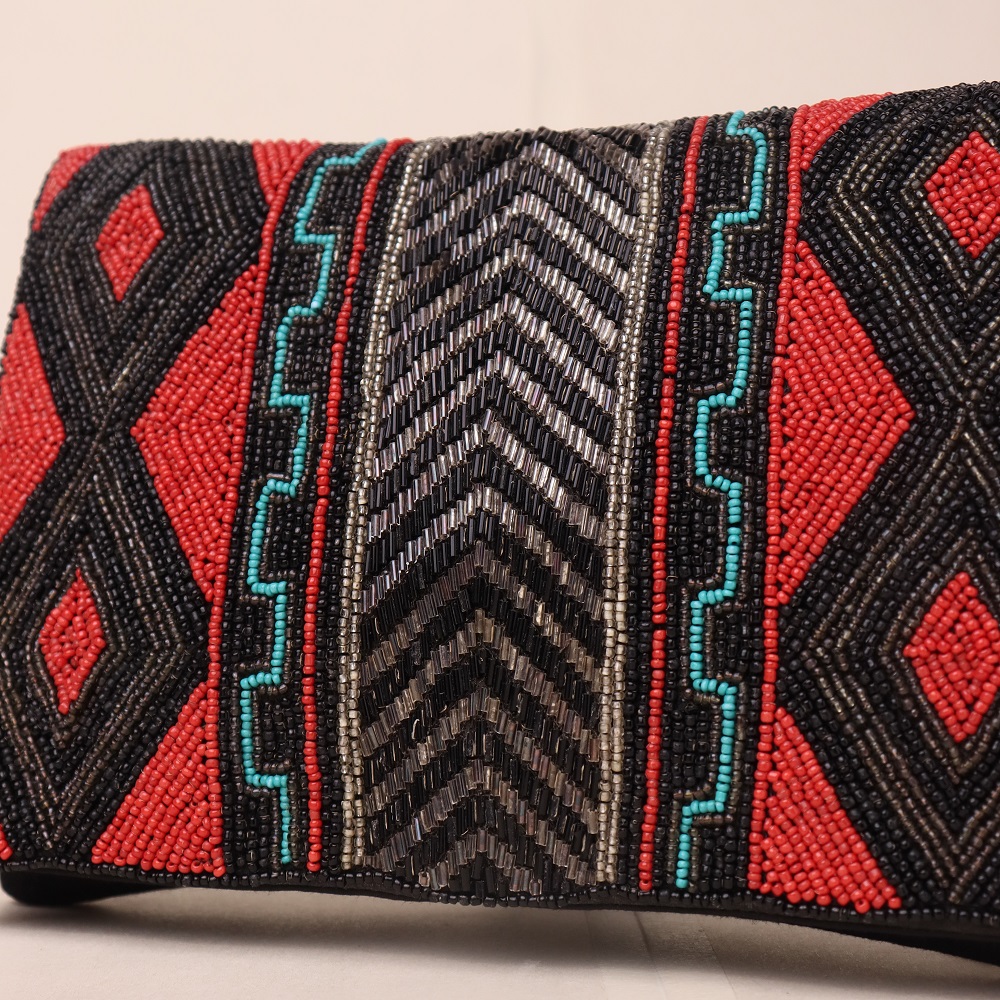 Unleash bold elegance with this handcrafted clutch, showcasing a striking tribal-inspired pattern made with intricate beadwork. The contrasting geometric motifs bring a sense of movement and cultural depth, making this clutch a showstopper for festive nights and bohemian-chic ensembles. Designed for versatility, it includes a detachable gold chain strap for effortless shoulder or crossbody wear, letting you switch between hands-free convenience and classic clutch styling.