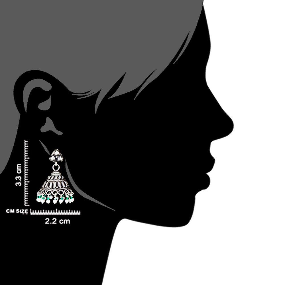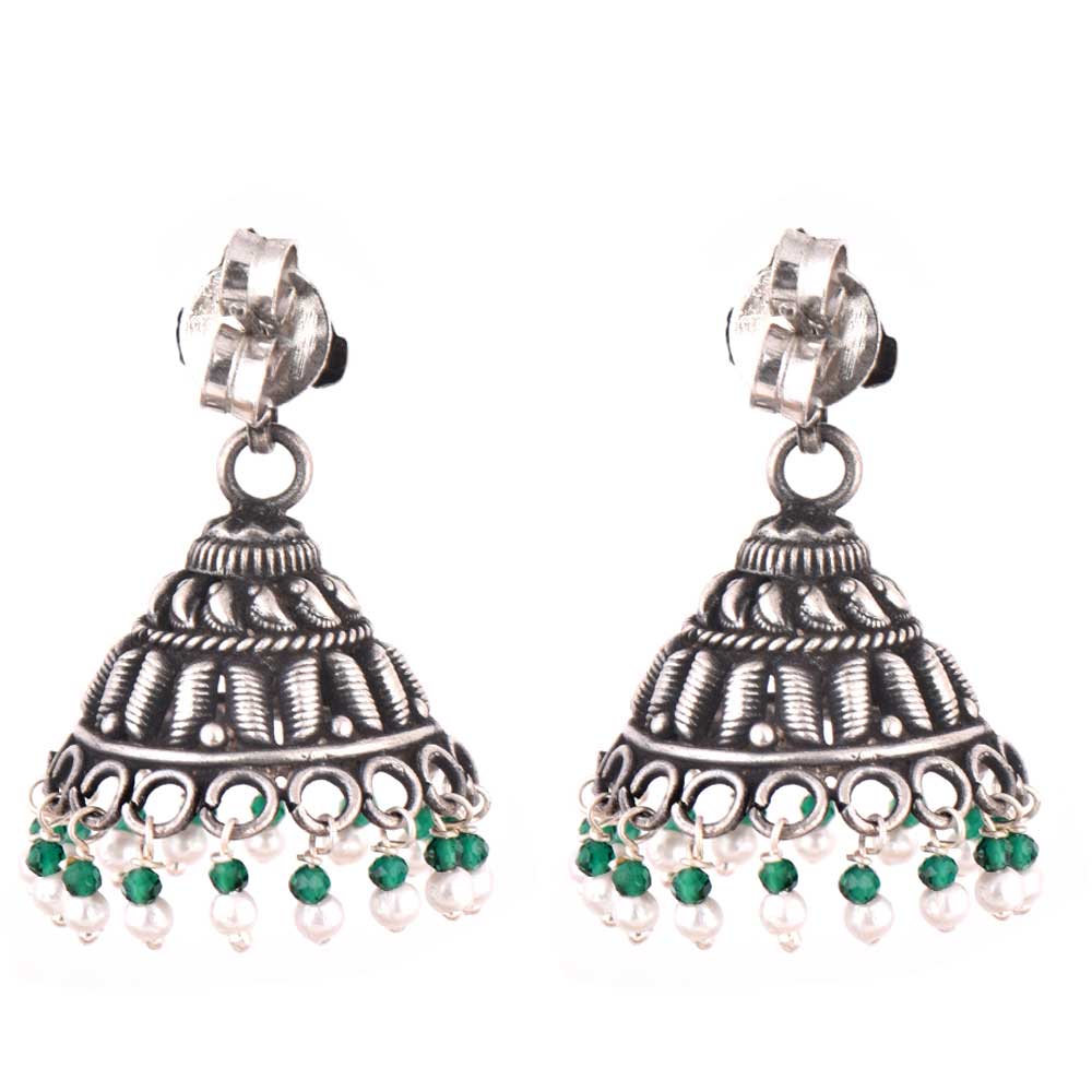 A very typical tribal style92.5 Sterling silver Earrings decorated with embossed design an green aventurine and pearl beads tassels at the bottom of the jhumki .Pair it with your favourite sari, suit, lehenga or other traditional outfit. Gift it to yourself or your near or dear ones on anniversary, wedding or valentine day.