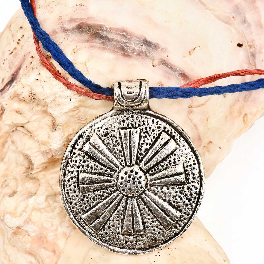 Celebrate the artistry of India’s tribal heritage with this Round Silver Aluminum Pendant Necklace, featuring a beautifully engraved large flower at the centre. Handcrafted from lightweight aluminum, this pendant combines the symmetry of tribal geometry with the natural charm of floral design. The radiant silver finish and embossed detailing give it a timeless, rustic elegance — making it the perfect statement accessory for those who appreciate culture, craftsmanship, and individuality.