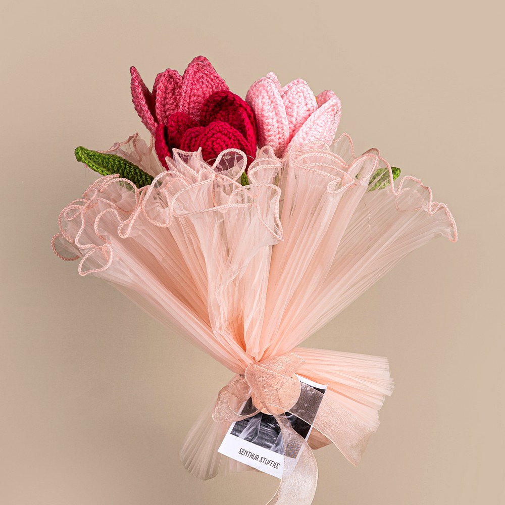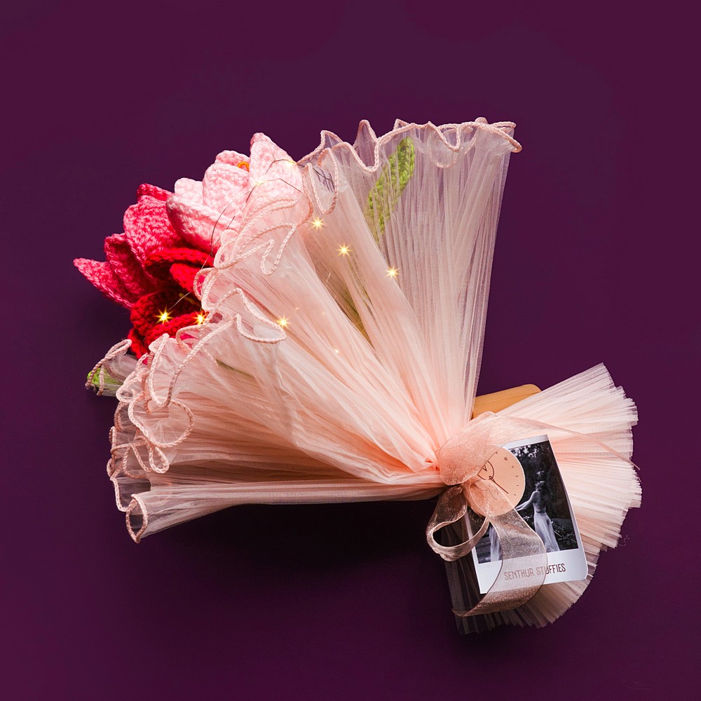 This pink bunch is lovingly crafted from soft acrylic yarn, fibre filling and craft wire, offering a fresh hue. Perfect for thoughtful gifters, it exudes hand-crafted charm and lasting appeal. Packed and quality-checked by Indianshelf. Each stitch is a testament to traditional artistry.