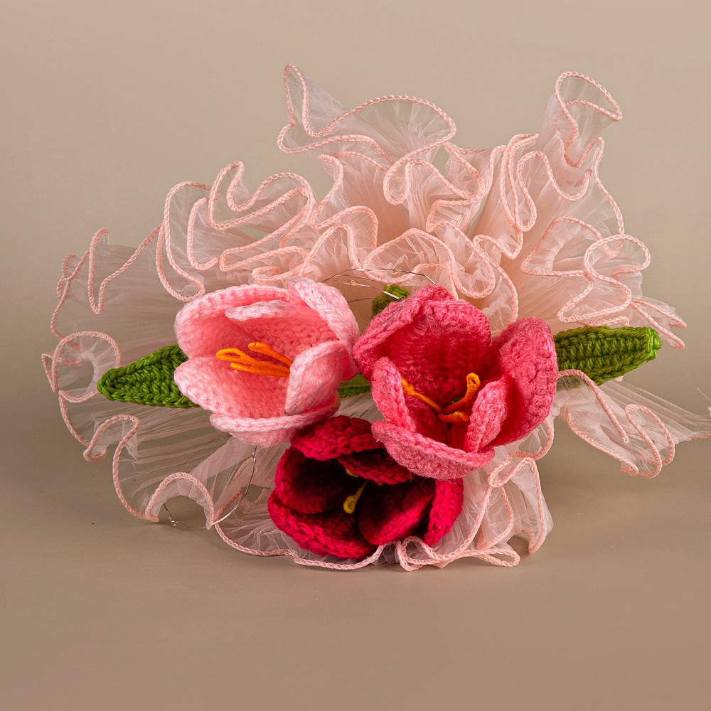 Trio of Crochet Tulips Ruffled Lace With Frilly Tulle