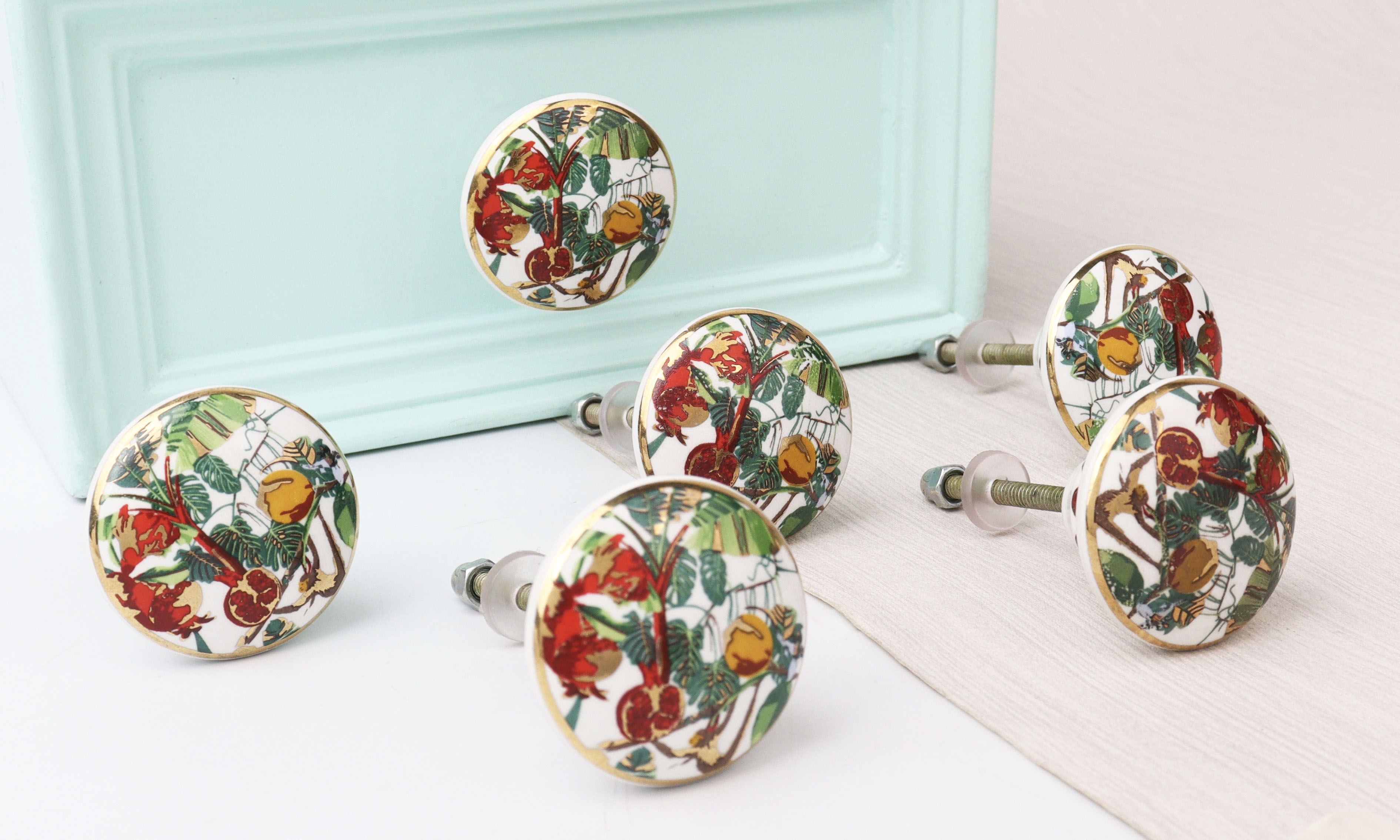 If you're looking for a simple yet impactful way to update your home décor, the Tropical Fruits & Animals Ceramic Cabinet Knobs with Gold Work are an excellent choice. Their charming designs will instantly refresh your furniture and brighten up any room.
