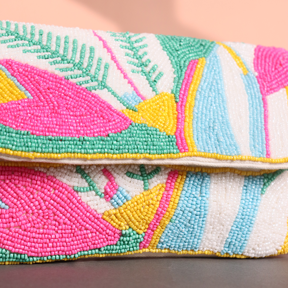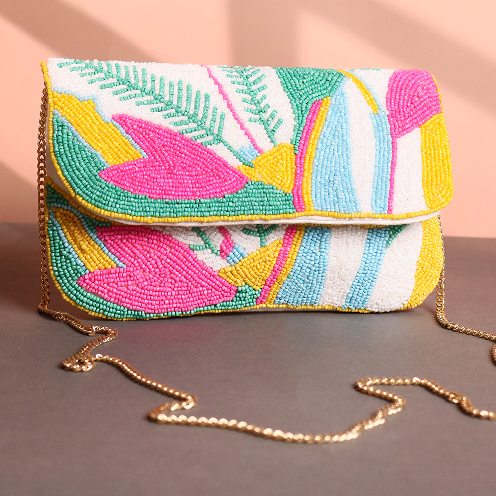Make a bold and playful statement with this Tropical Vibes Hand-Beaded Sling Clutch. Adorned with vibrant beadwork in shades of pink, green, yellow, and turquoise, this bag features an abstract tropical leaf design that brings instant cheer to any outfit. The gold chain strap adds a touch of elegance, making it perfect for both daytime events and evening parties.Handcrafted with meticulous detail, this clutch is ideal for fashion lovers who appreciate artistic flair and eye-catching accessories. Whether paired with a summer dress or a sleek evening look, this bag is designed to turn heads.