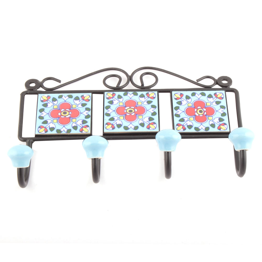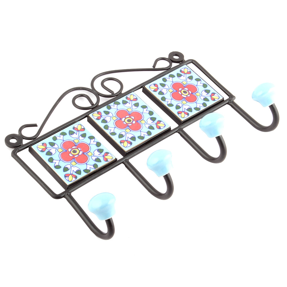 Turquoise And Red Floral Tiles Hooks. When Put on Wall or Cabinet it is an Art in itself. The Metal Part of this Hook is Black Powder Coated.