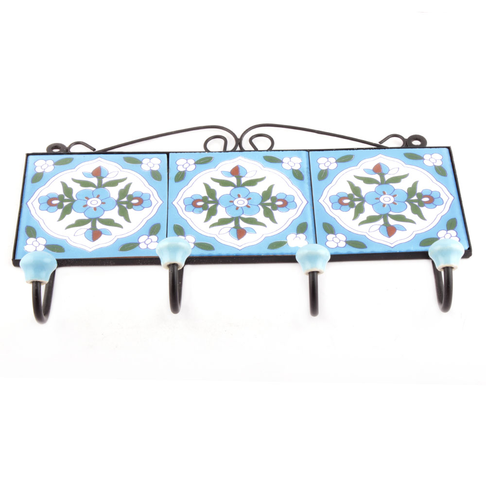 Turquoise And White Floral Tiles Hooks Online. When Put on Wall or Cabinet it is an Art in itself. The Metal Part of this Hook is Black Powder Coated.