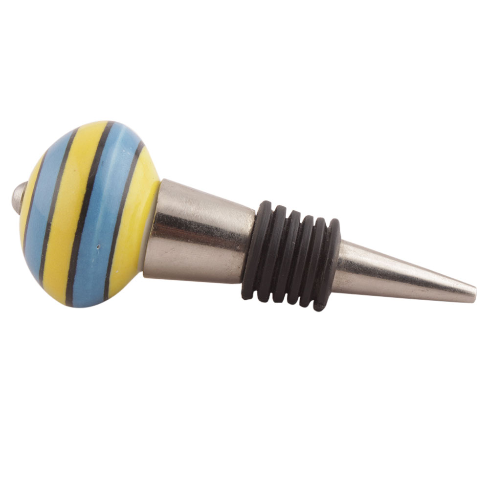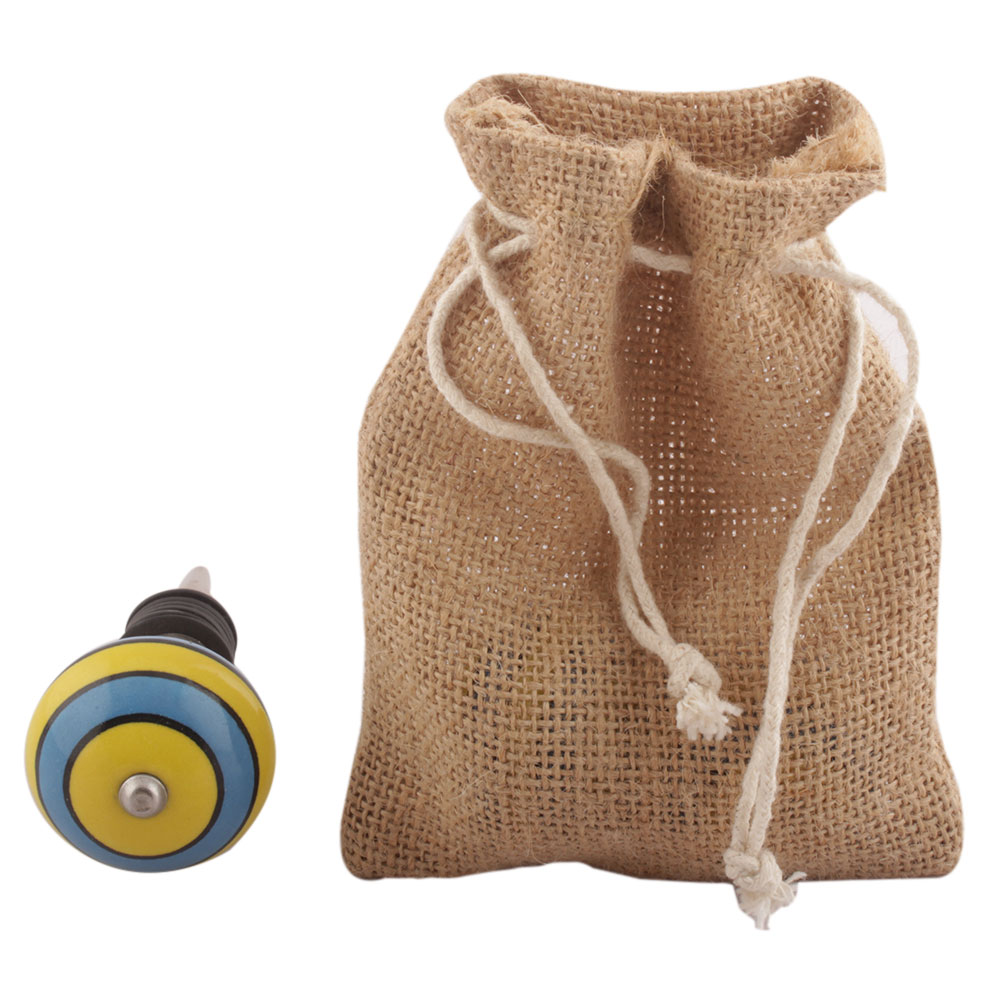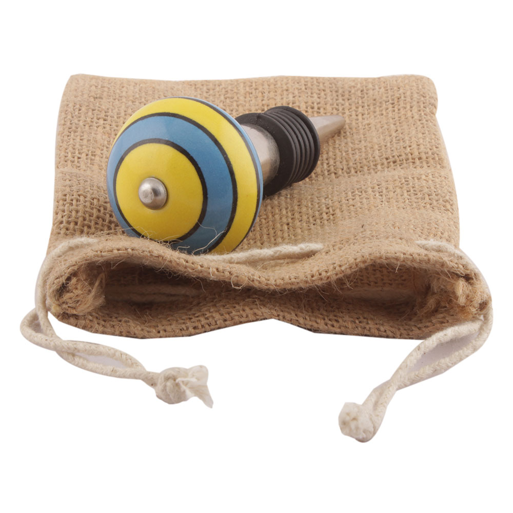 Turquoise And Yellow Striped Ceramic Wine Stopper. Zinc Alloy Wine Bottle Stopper with Attractive Jute Bag Packaging.