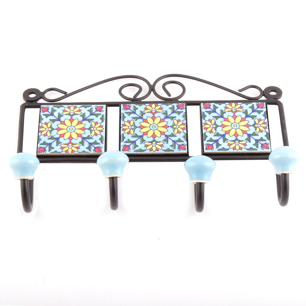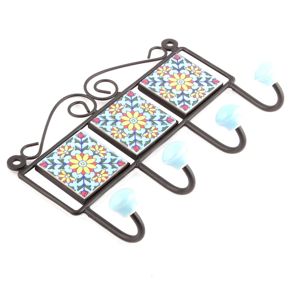 Turquoise And Yellow Sun Flower Tiles Hooks. When Put on Wall or Cabinet it is an Art in itself. The Metal Part of this Hook is Black Powder Coated.