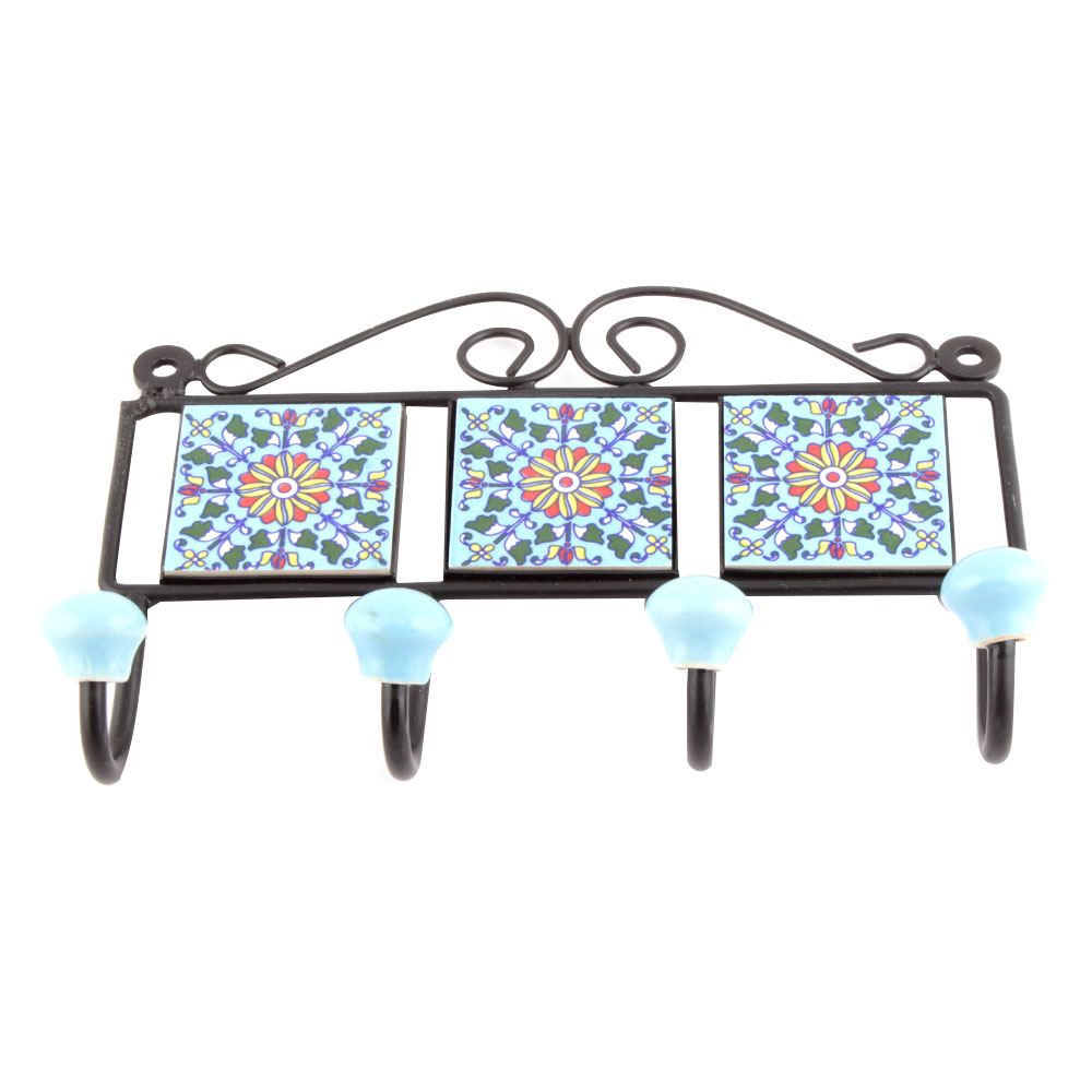 Turquoise And Yellow Sunflower Tiles Hooks. When Put on Wall or Cabinet it is an Art in itself. The Metal Part of this Hook is Black Powder Coated.