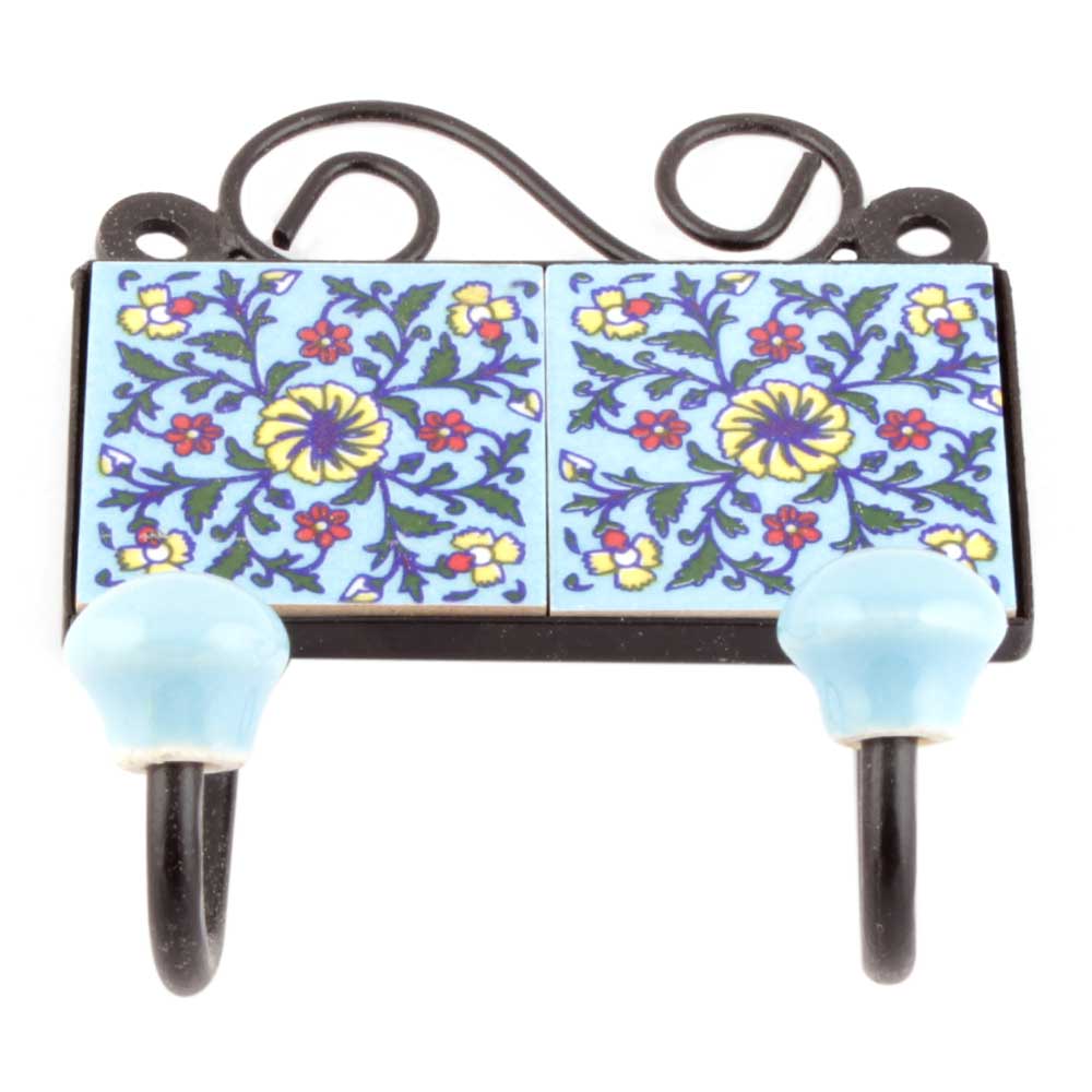 Turquoise And Yellow Wheel Flower Tiles Hooks. When Put on Wall or Cabinet it is an Art in itself. The Metal Part of this Hook is Black Powder Coated.