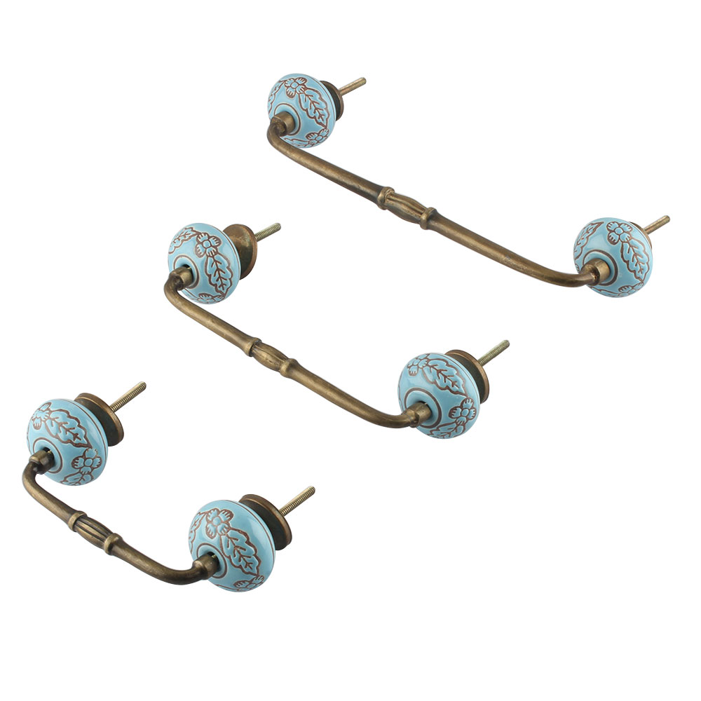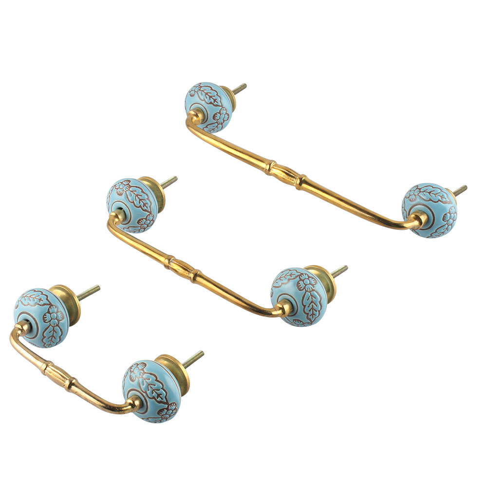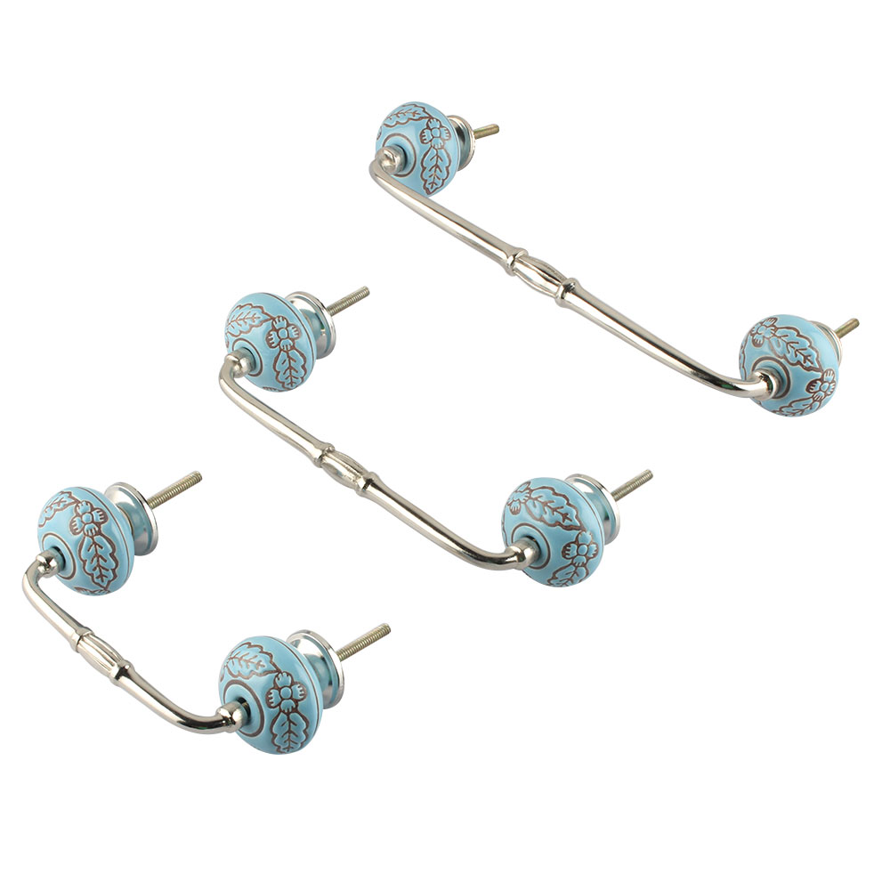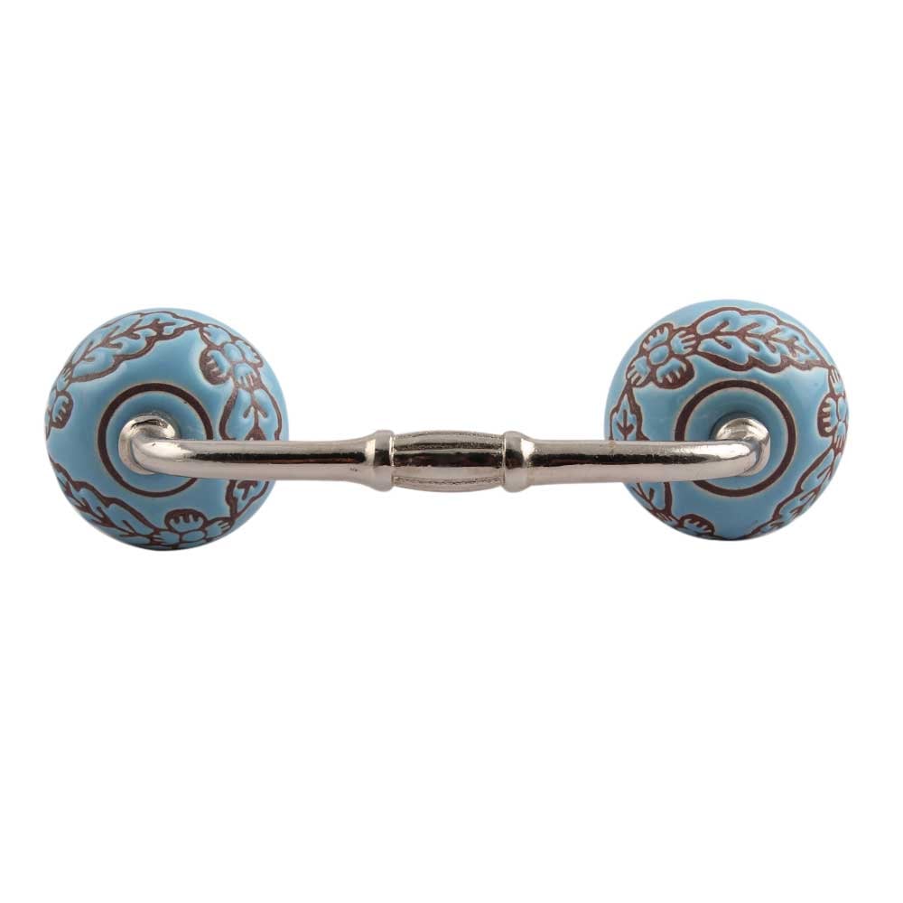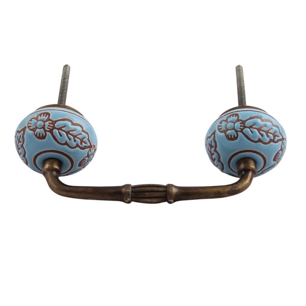 Turquoise Base Brown Leaf Flower Etched Ceramic Bridge Handle. Ideal for Drawer, Dresser, Cabinet, Wardrobe, Cupboard and Almirah.