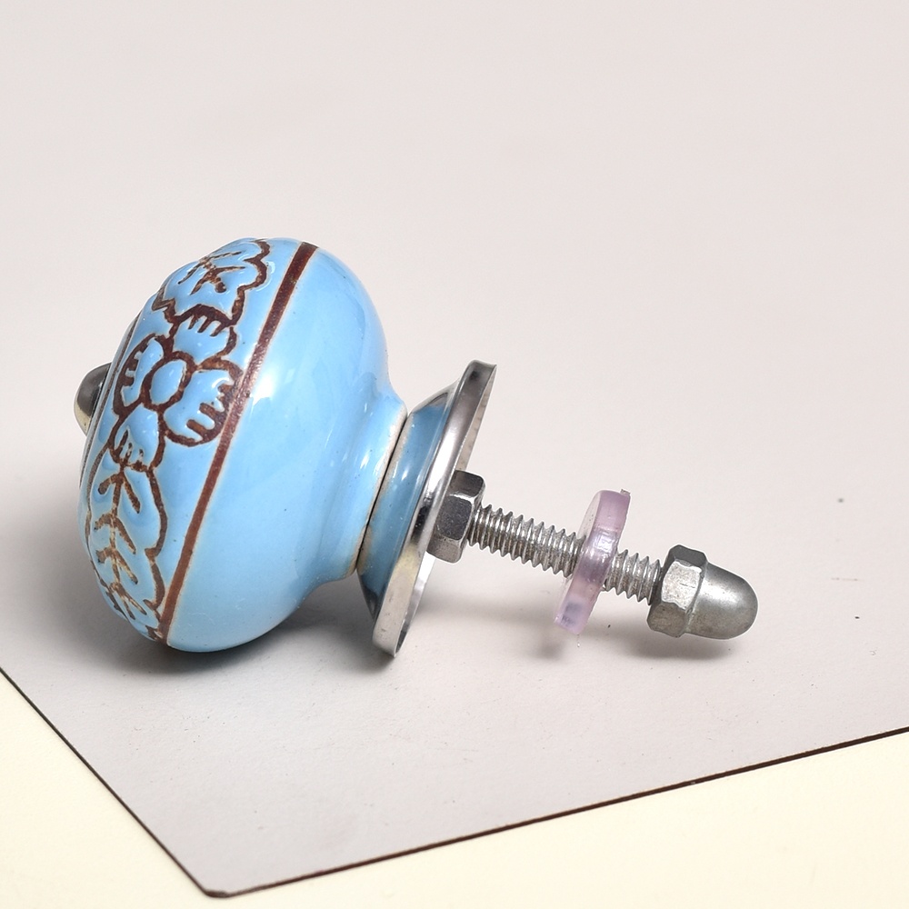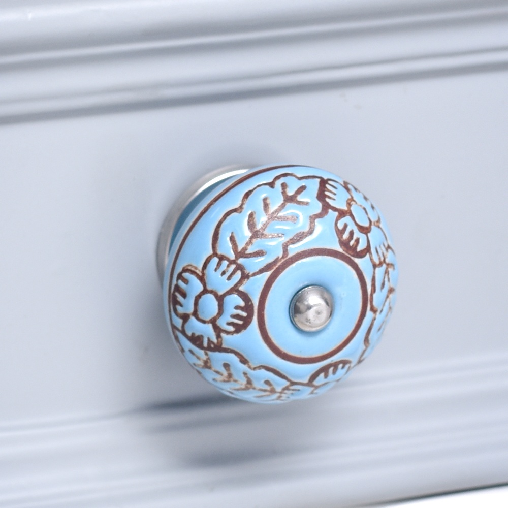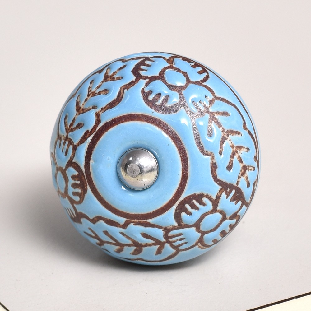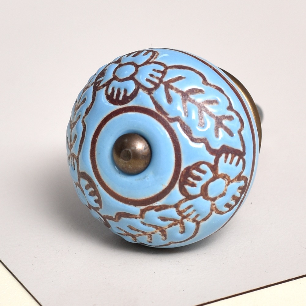 Turquoise Base Brown Leaf Flower Etched Ceramic Drawer Knob