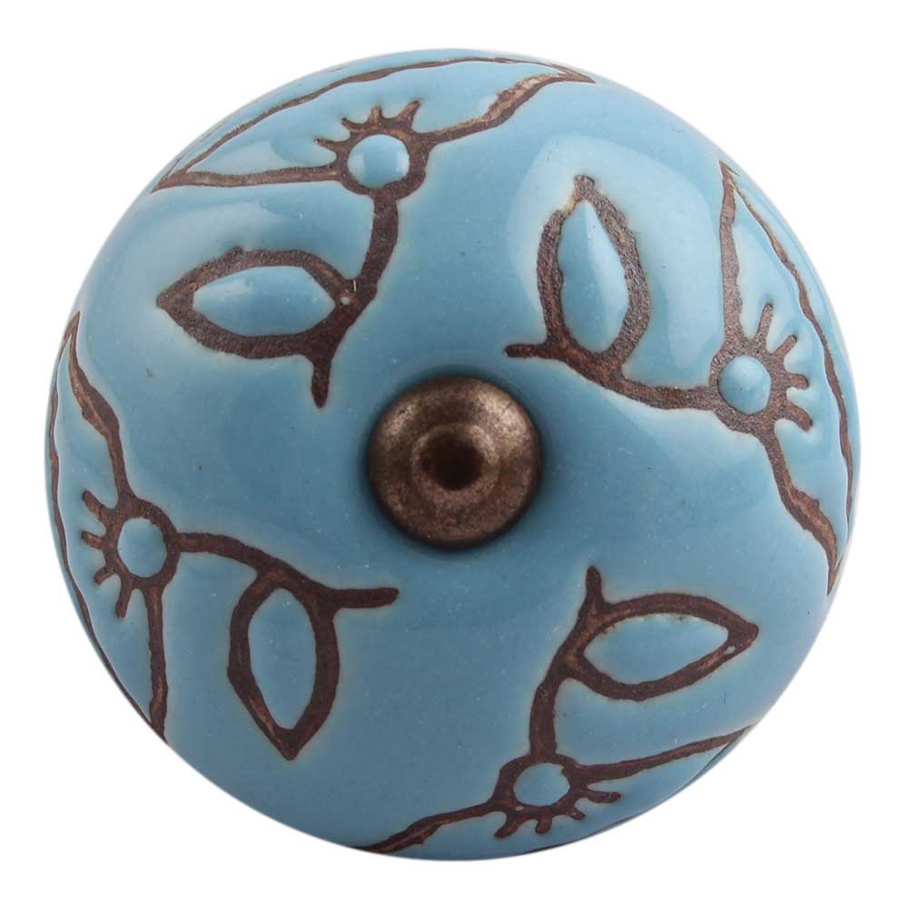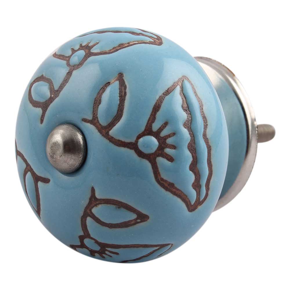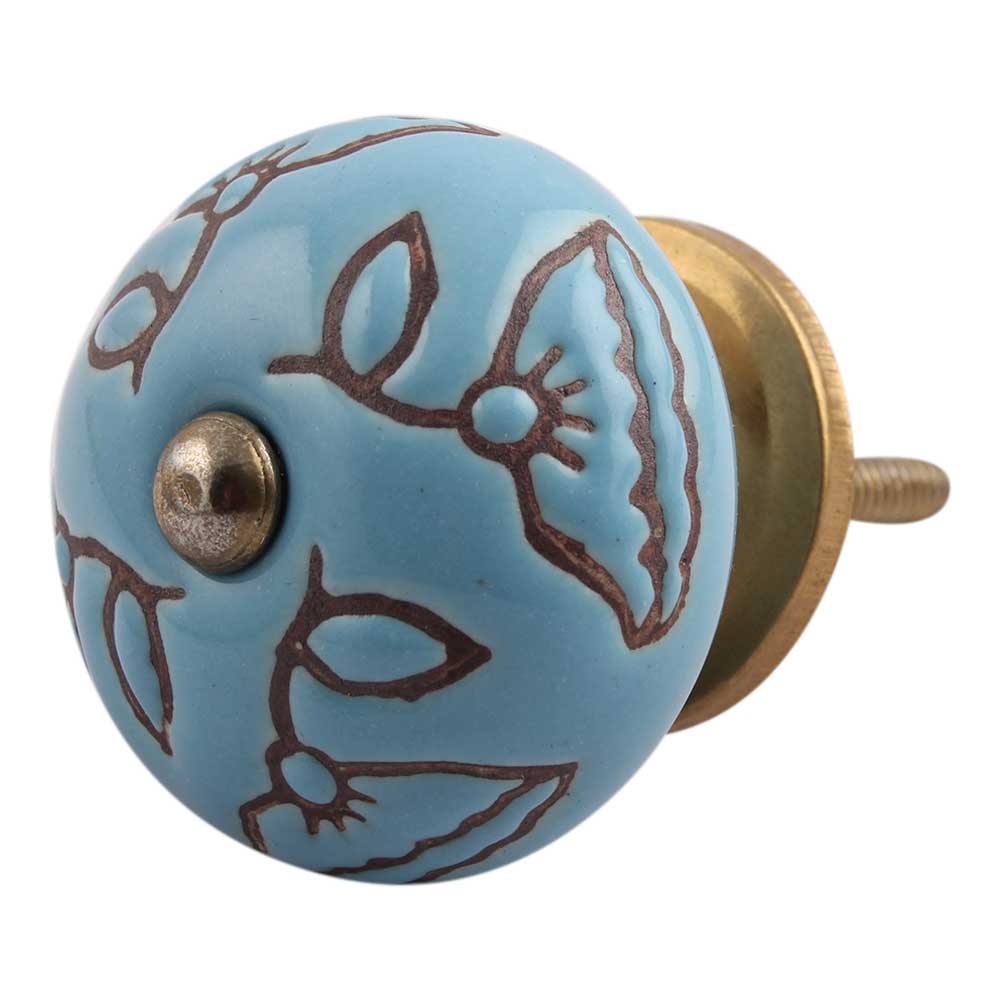 Turquoise Calla Lily Brown Etched Ceramic Cabinet Knob