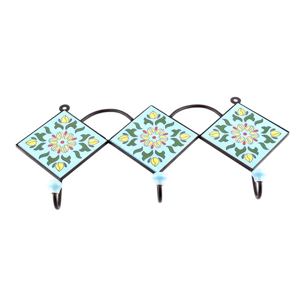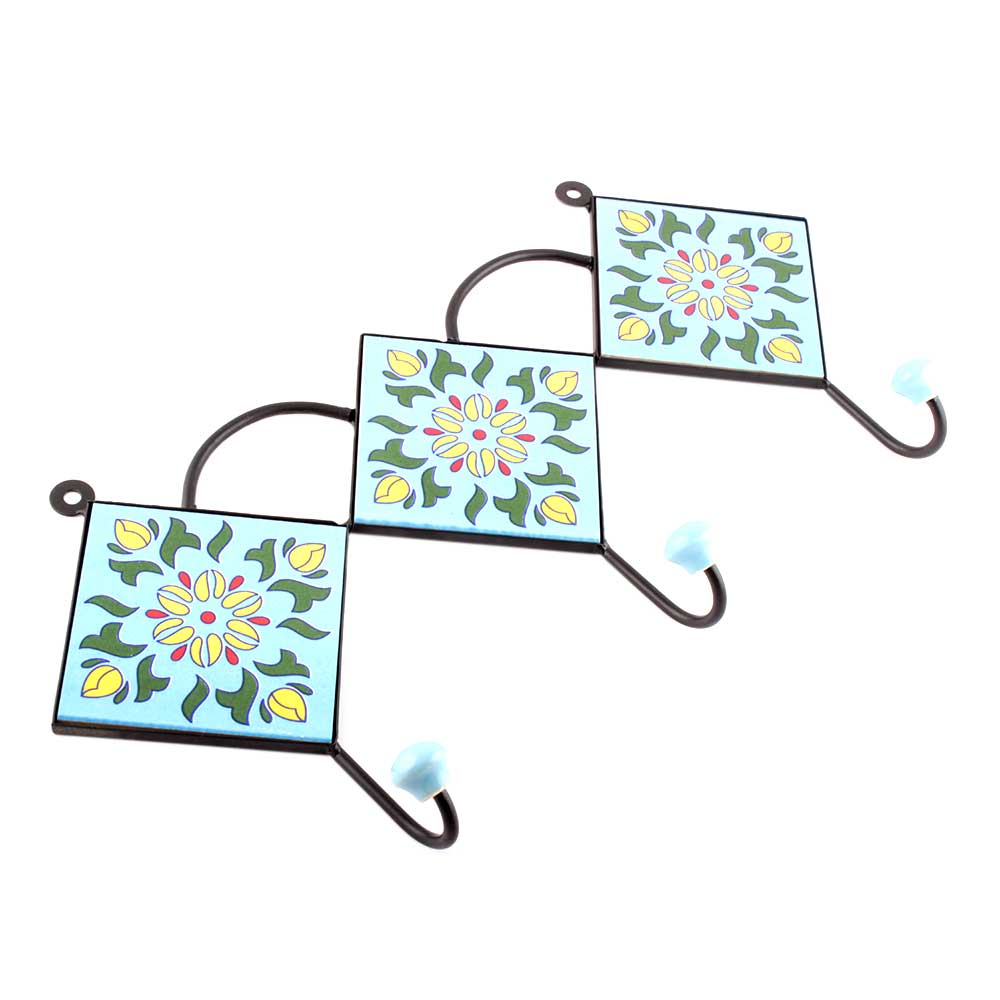 Turquoise Ceramic Floral Tiles Hooks Online. When Put on Wall or Cabinet it is an Art in itself. The Metal Part of this Hook is Black Powder Coated.