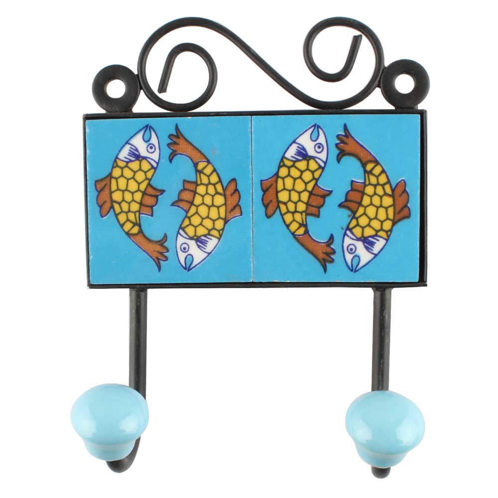 Turquoise Fish Ceramic Tiles Hook. When Put on Wall or Cabinet It is An Art in Itself. The Metal Part of this Hook is Black Powder Coated.