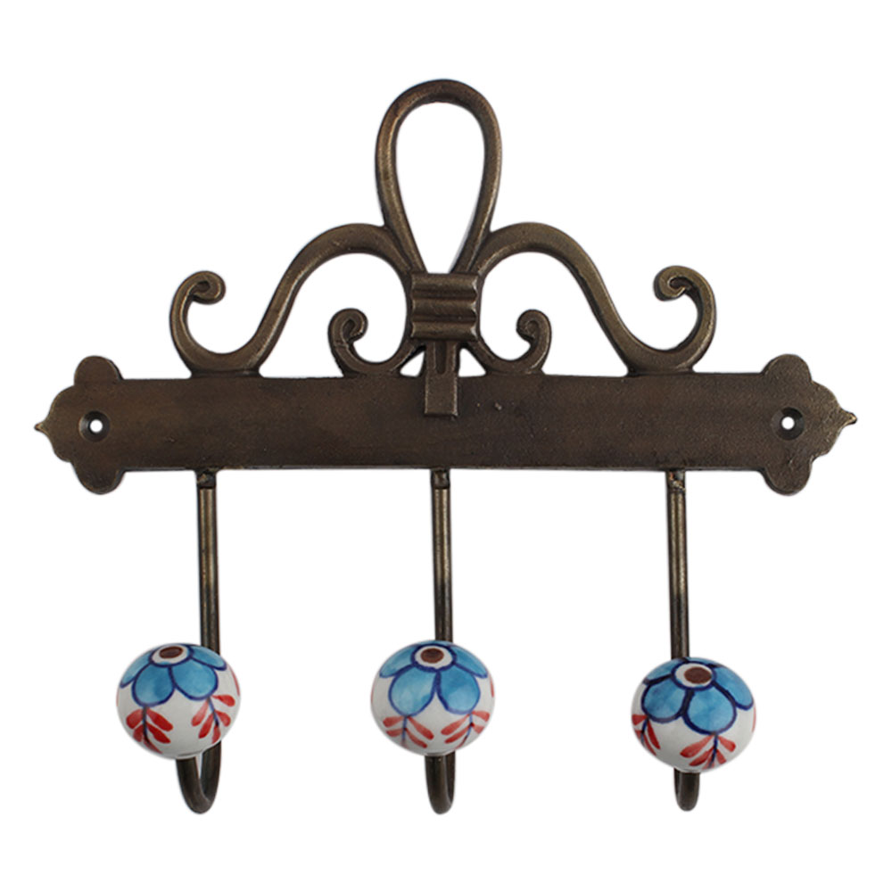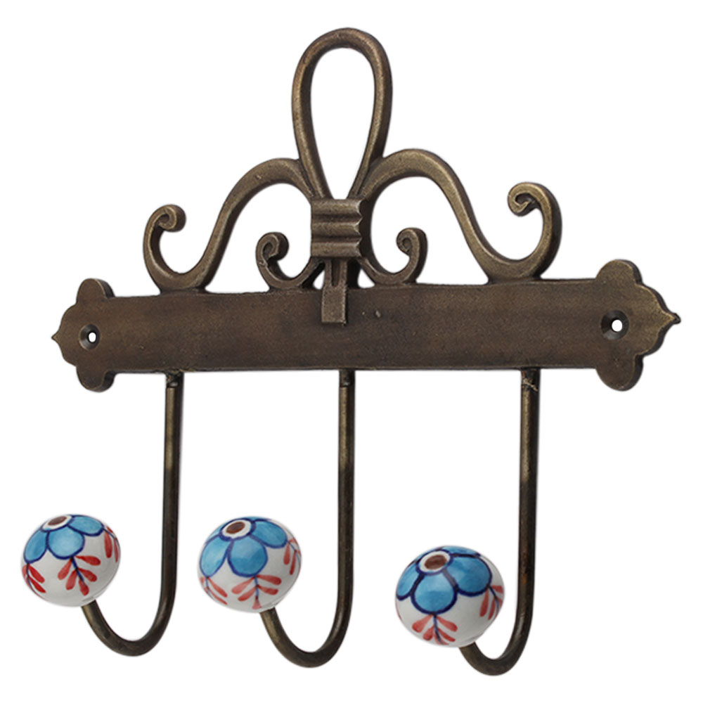 Turquoise Floral Ceramic Iron Hook. A Perfect Complement to the Soft Tone of the Wood are these White Traditional Hat & Coat Hook Made of Genuine Porcelain and Brass. It can be use to Hang Jewellery, Leashes, Towels, Scarves, Light Weight Sweaters, Caps Etc.