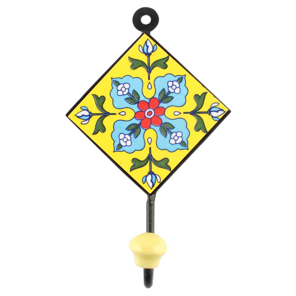 Turquoise Floral Ceramic Tile Hook. When Put on Wall or Cabinet It is An Art in Itself. The Metal Part of this Hook is Black Powder Coated.
