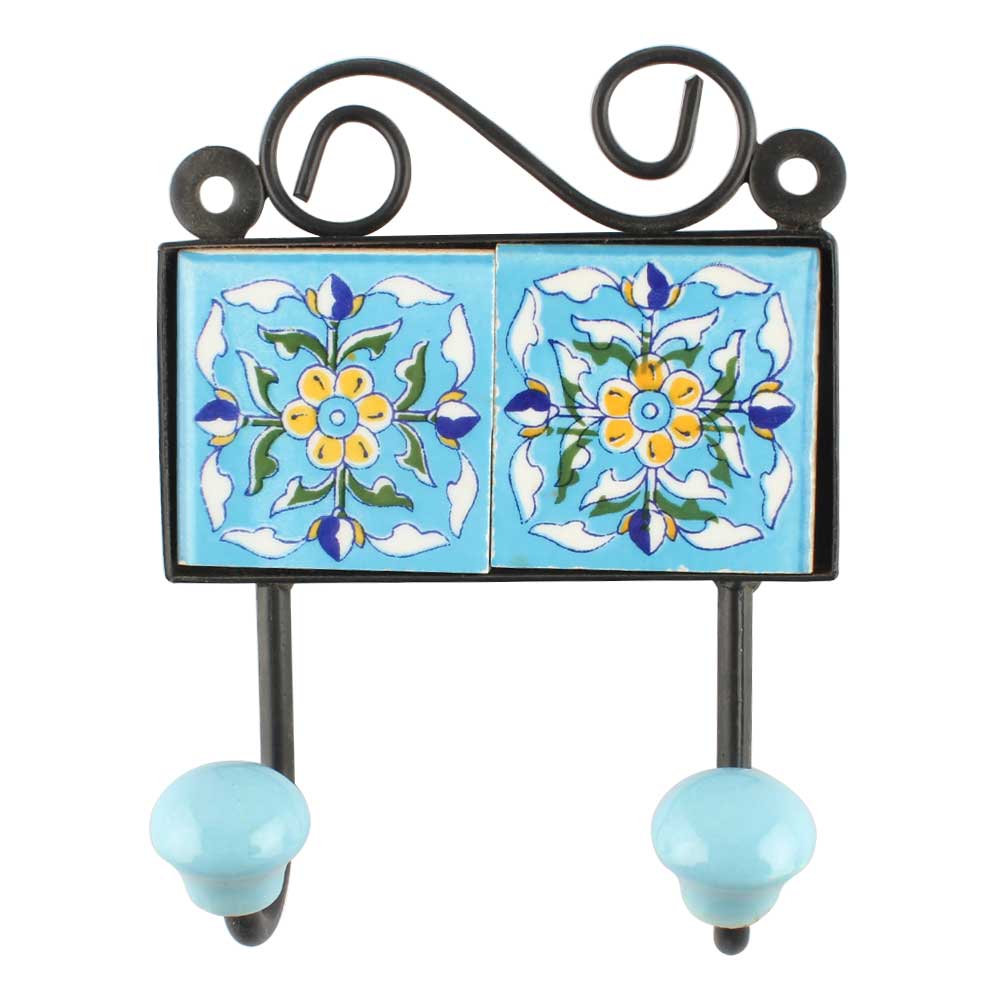 Turquoise Floral Ceramic Tiles Hook. When Put on Wall or Cabinet It is An Art in Itself. The Metal Part of this Hook is Black Powder Coated.