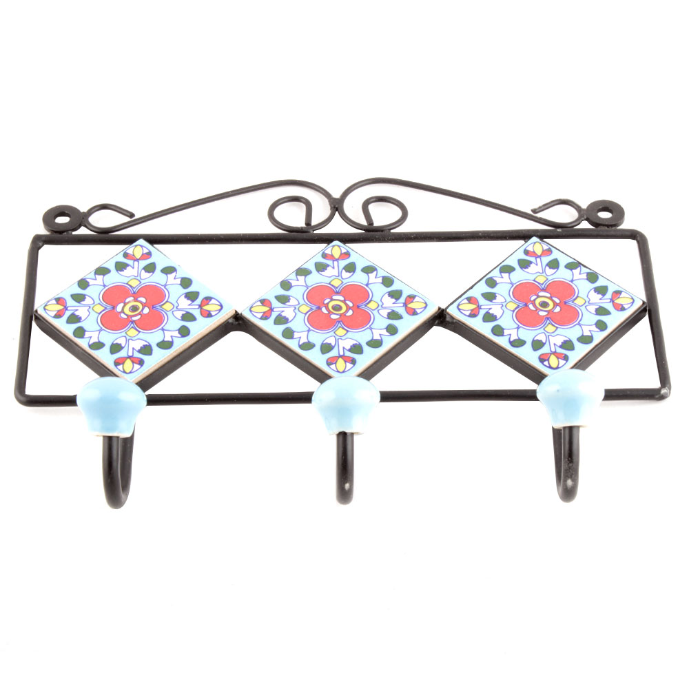 Turquoise Red Floral Tiles Hooks. When Put on Wall or Cabinet it is an Art in itself. The Metal Part of this Hook is Black Powder Coated.
