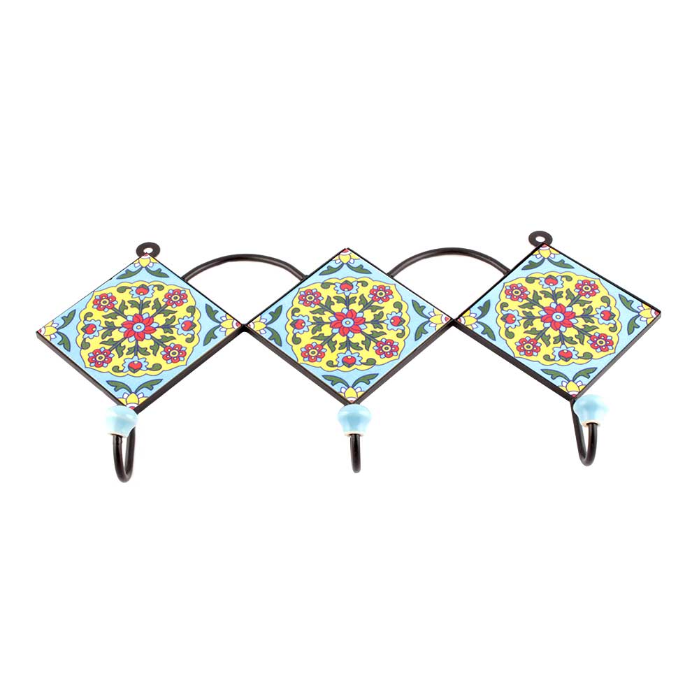 Turquoise Red Tiny Ceramic Floral Tiles Hooks. When Put on Wall or Cabinet it is an Art in itself. The Metal Part of this Hook is Black Powder Coated.