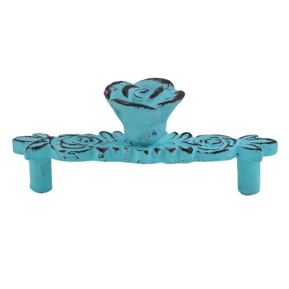 The intricate turquoise rose design on each pull offers a bold contrast against the distressed iron finish, giving it a unique, weathered look that adds character to your furniture. The combination of vibrant color and industrial-style metal work creates an eclectic, eye-catching look that will instantly elevate the style of any cabinet, drawer, or piece of furniture.