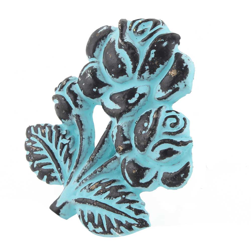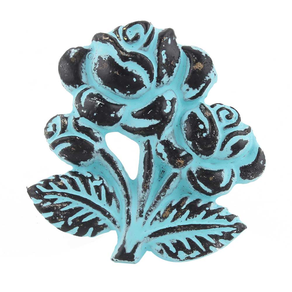 The Turquoise Rose with Branch Distressed Iron Dresser Knob features a vibrant turquoise-colored rose paired with delicate branch details. Its unique design adds a fresh, whimsical touch, making it an ideal accent for any piece of furniture in need of a colorful and elegant upgrade.