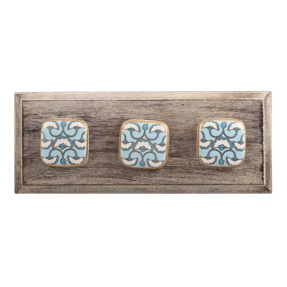 Turquoise Sea Shell Design Square Ceramic Wooden Hook. A Perfect Complement to the Soft Tone of the Wood are these White Traditional Hat & Coat Hook Made of Genuine Porcelain and Brass. It can be use to Hang Jewellery, Leashes, Towels, Scarves, Light Weight Sweaters, Caps Etc.