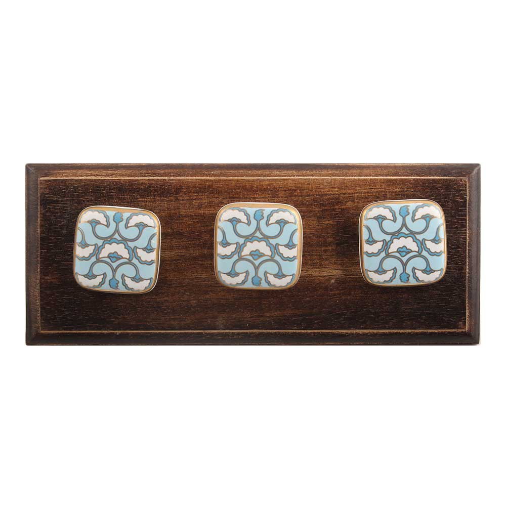 Turquoise Sea Shell Design Square Ceramic Wooden Hook. A Perfect Complement to the Soft Tone of the Wood are these White Traditional Hat & Coat Hook Made of Genuine Porcelain and Brass. It can be use to Hang Jewellery, Leashes, Towels, Scarves, Light Weight Sweaters, Caps Etc.