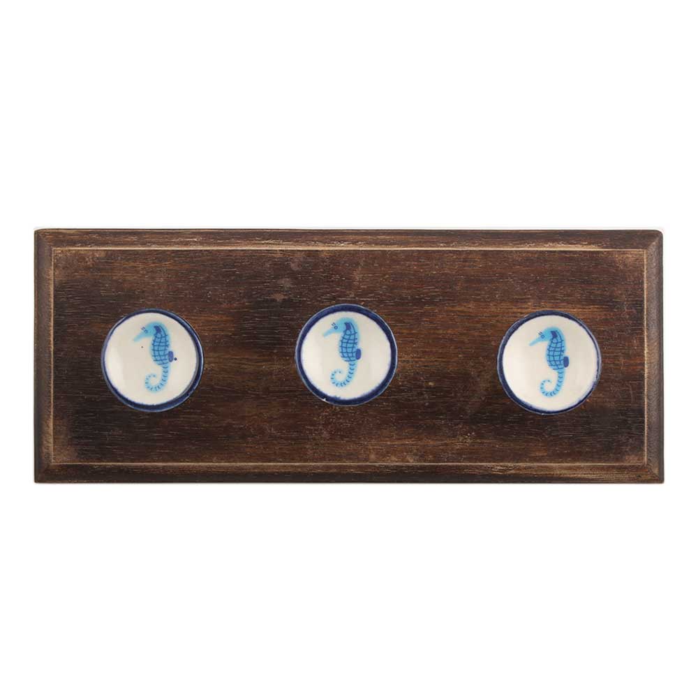 Turquoise Seahorse Flat Ceramic Wooden Hook. A Perfect Complement to the Soft Tone of the Wood are these White Traditional Hat & Coat Hook Made of Genuine Porcelain and Brass. It can be use to Hang Jewellery, Leashes, Towels, Scarves, Light Weight Sweaters, Caps Etc.